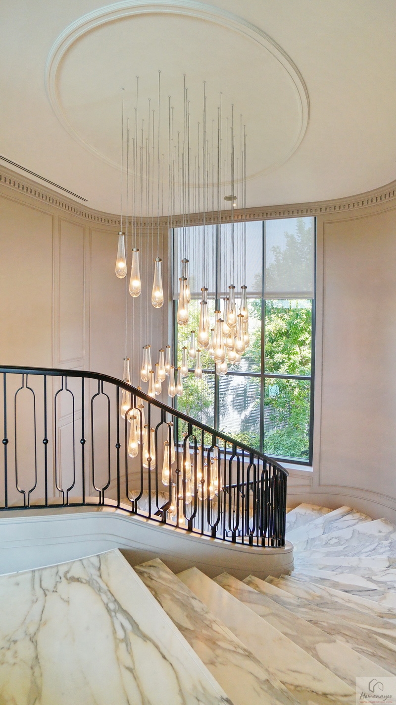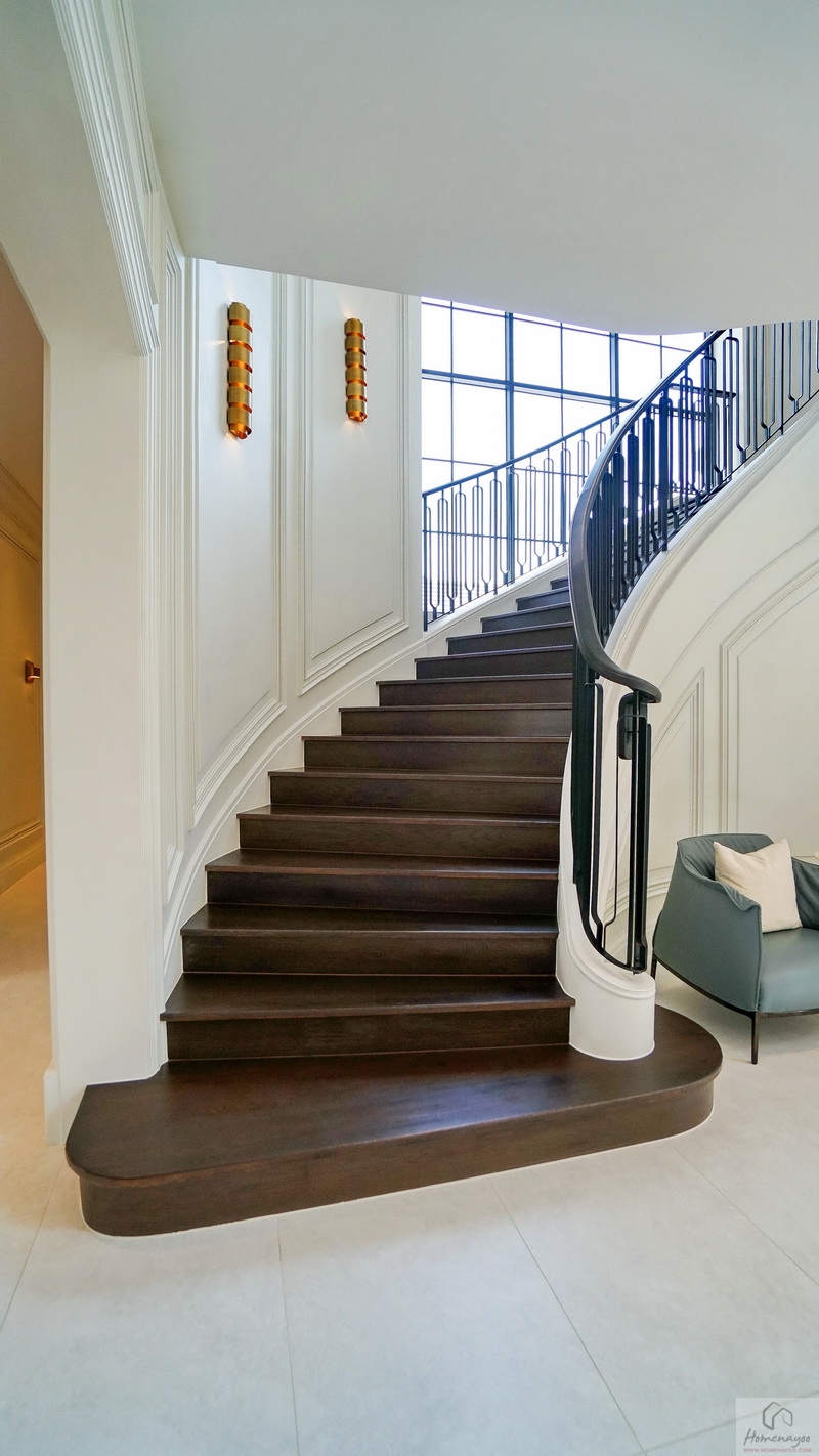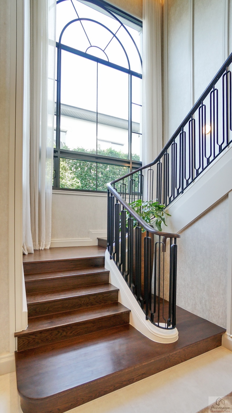 โถงบันไดบ้านบรรยากาศสูง โปร่ง โล่ง ต่อเนื่องมาจากพื้นที่ Double Volume มีช่องแสงขนาด Oversize ให้หลายชุด มองเห็นวิวด้านนอกได้กว้างเต็มตา