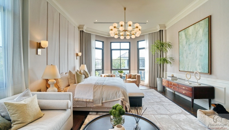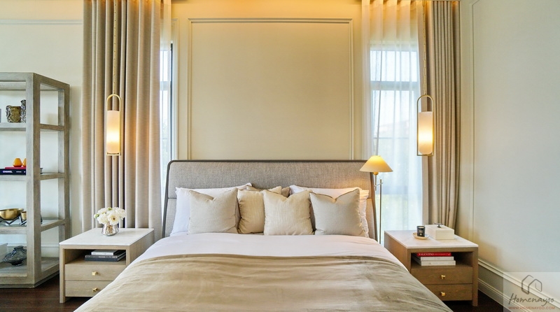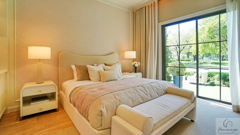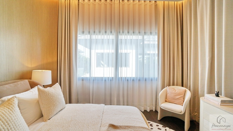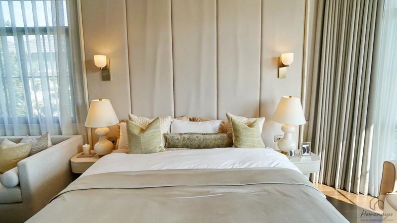 ฝั่งหัวเตียงวางโต๊ะด้านข้างได้ทั้ง 2 ฝั่ง พร้อมช่องแสงบานใหญ่ขนาด Oversize ส่วนบ้านตัวอย่างกรุผนังบานเลื่อนช่วยบังแสงให้ดูเป็นไอเดีย