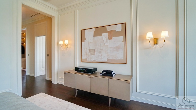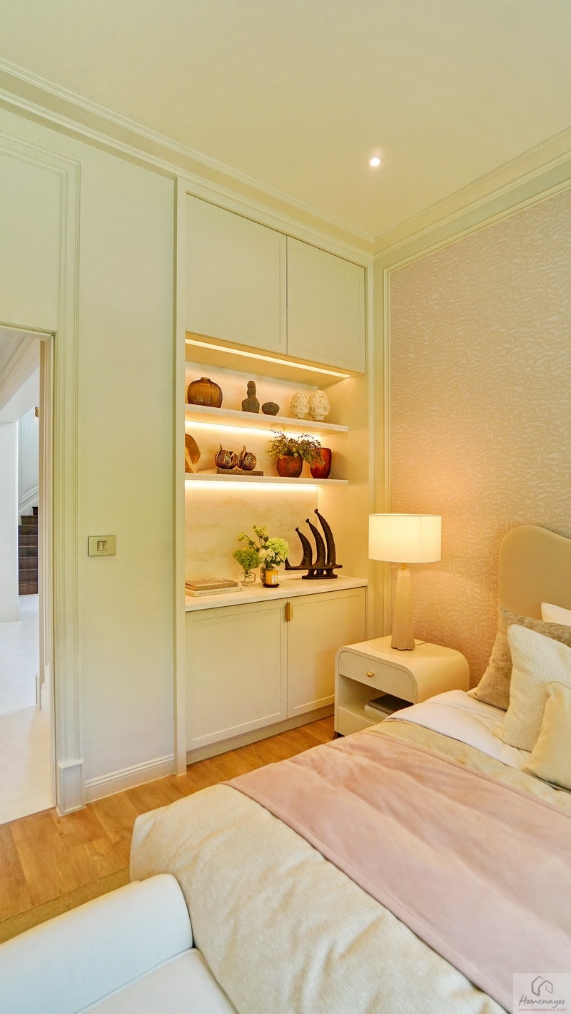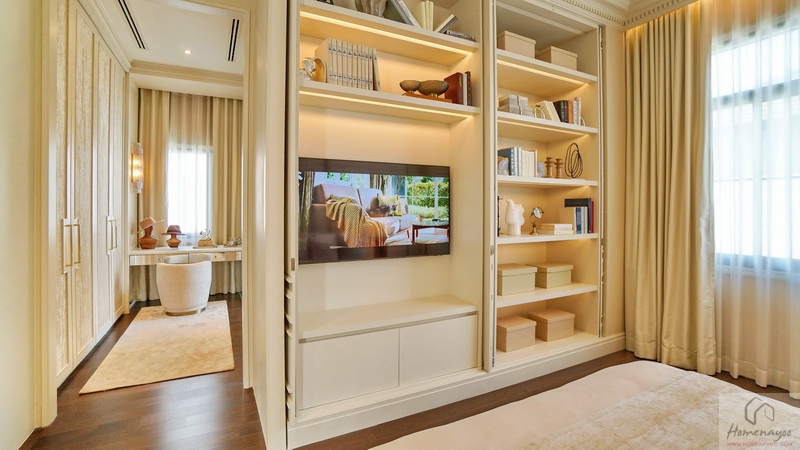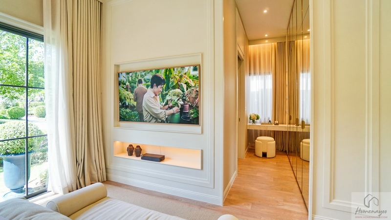 ฝั่งปลายเตียงผนังกว้าง Built-in ชั้นวางทีวีได้เต็มพื้นที่ หรือจะวาง Sideboard แล้วแขวน Smart TV ไว้บนผนังก็ได้