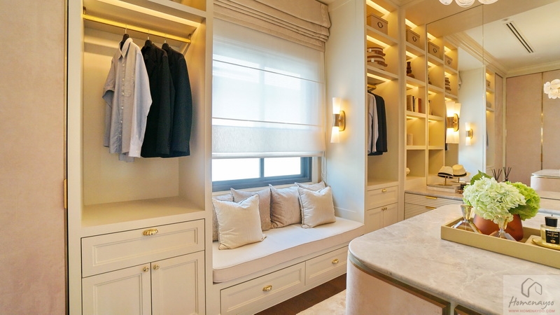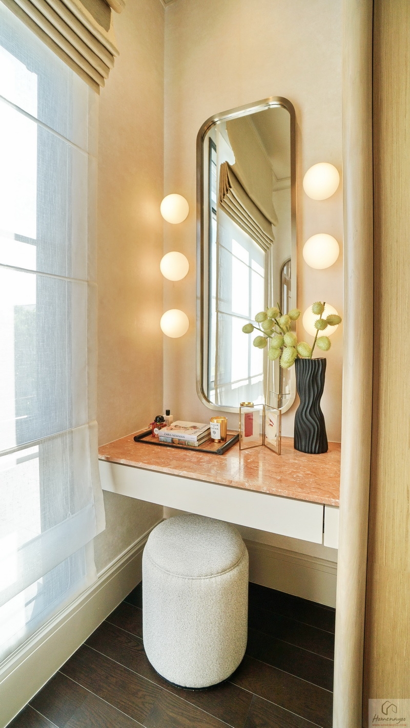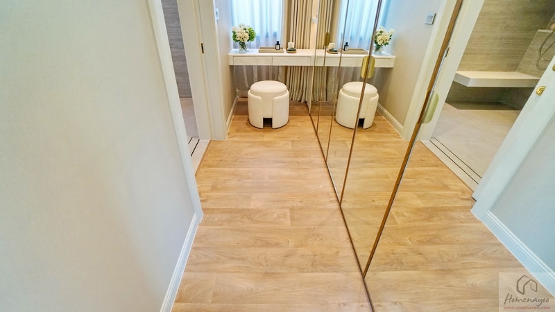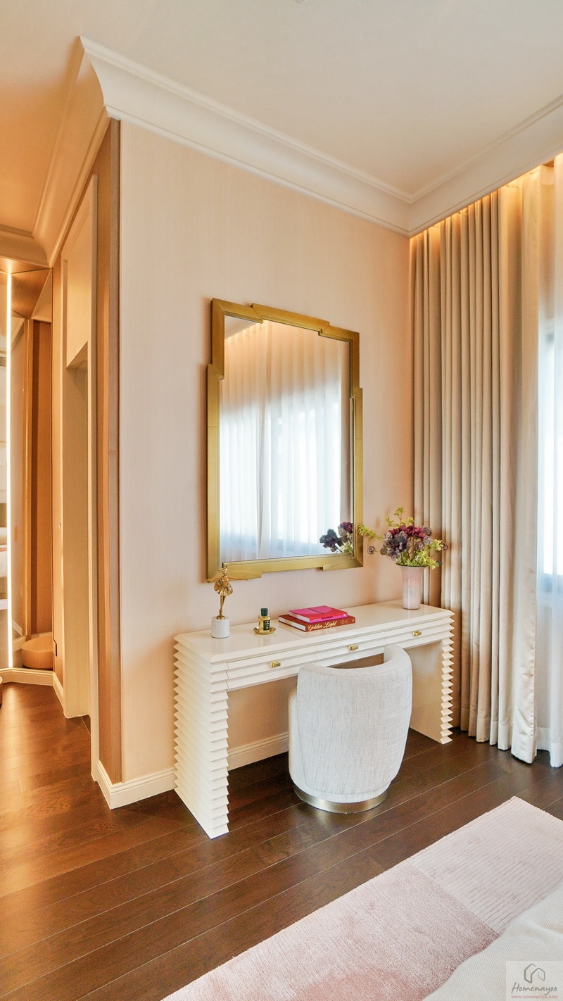 ถัดเข้าไปอีกฝั่งของห้องจะเป็นโซน Walk-in Closet พื้นที่ตรงกลางจัดเป็นมุมโต๊ะเครื่องแป้งขนาด 1 ที่นั่ง จุดนี้มีช่องแสงบานกระทุ้งให้ 1 ชุด