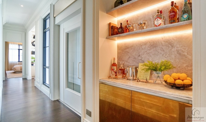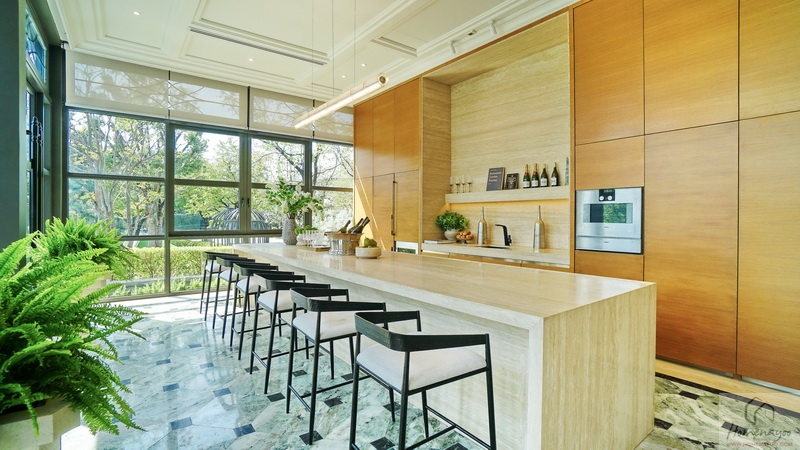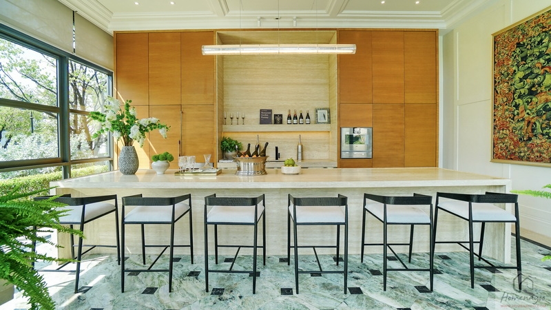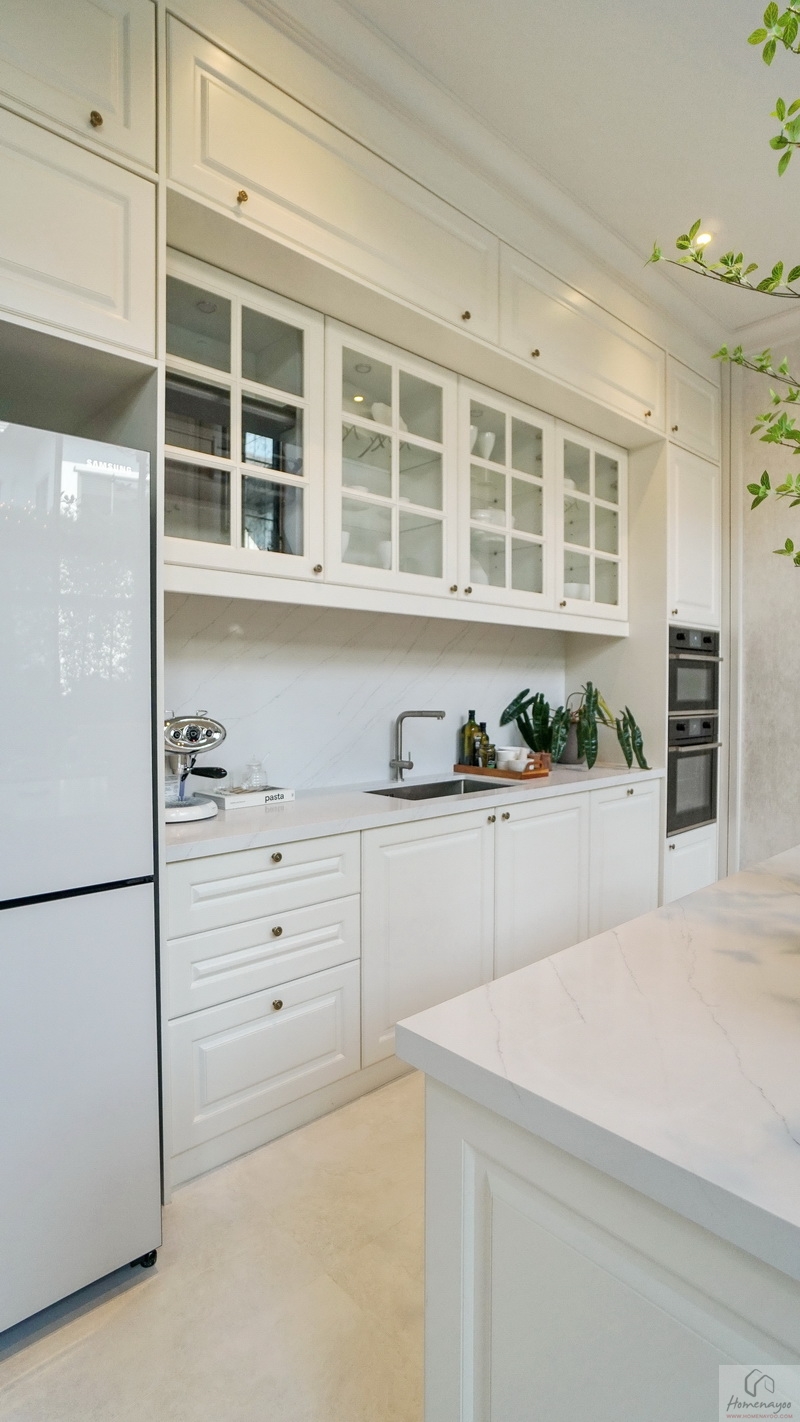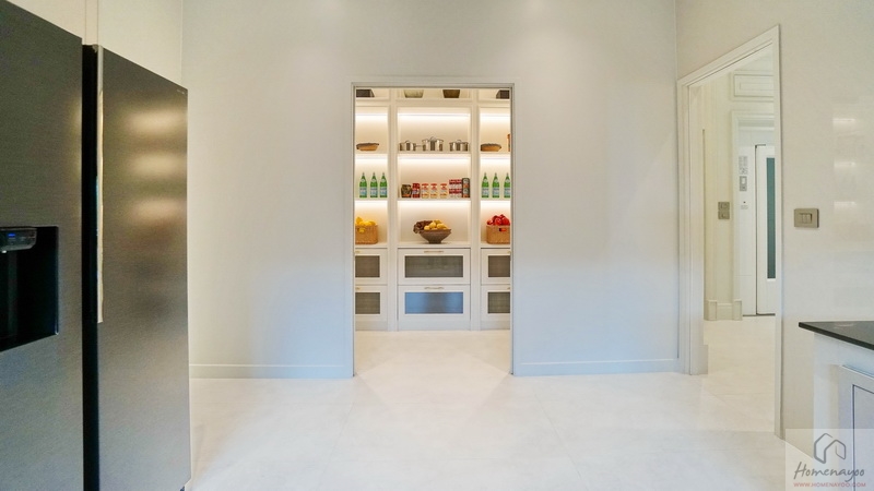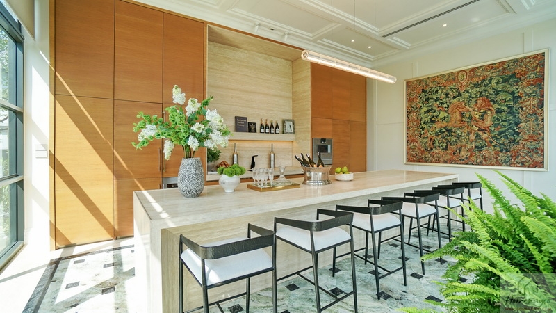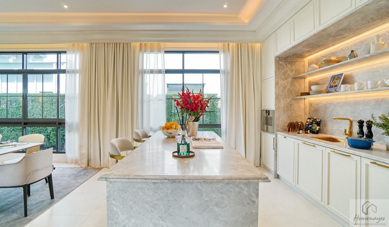 ติดกับ Dining Area จะเป็น Pantry มีการ Built-in เคาน์เตอร์ครัวสีขาวไว้ชิดผนังด้านข้าง ตรงกลางวางเป็น Kitchen Island สำหรับนั่งทานขนม, ของว่าง หรือจิบเครื่องดื่ม ดีไซน์อย่างปราณีตด้วยการผสมผสานระหว่างหินอ่อน Fendi White กับแผงทองเหลือง