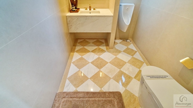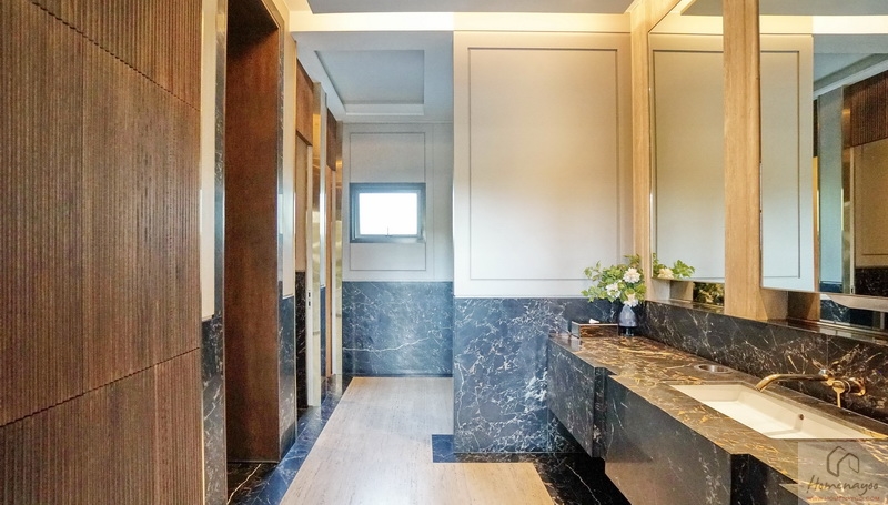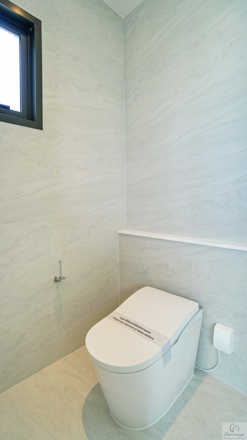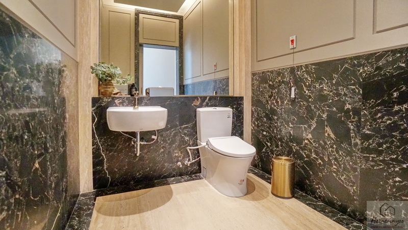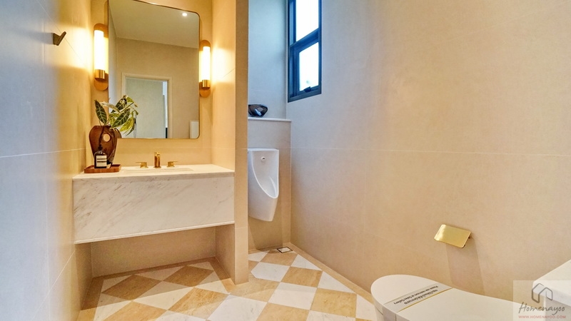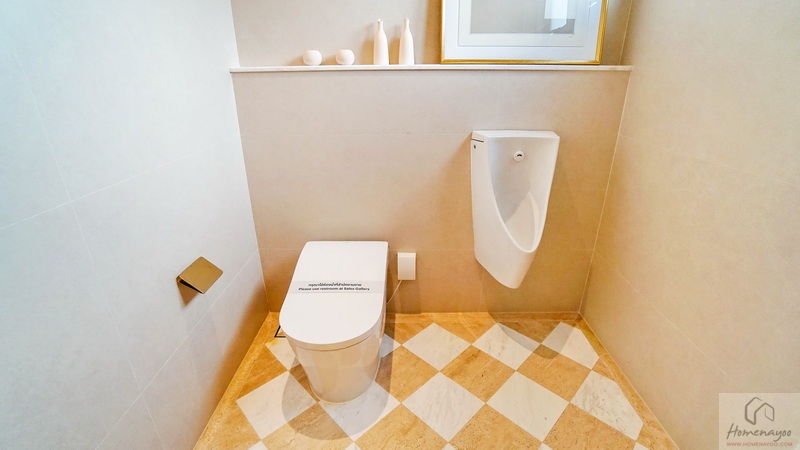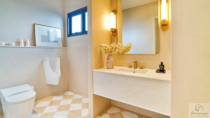 ส่วนห้องน้ำชั้นล่างเป็นแบบ Powder Room คือจะไม่มีส่วนอาบน้ำนั่นเอง ภายในกว้างตกแต่งพื้นด้วยกระเบื้องลวดลายโทนสีขาว-น้ำตาลทอง จัดมุมใช้งานครบครันทั้งโซนอ่างล้างหน้า, โถสุขภัณฑ์ชาย, มุมโถสุขภัณฑ์อัตโนมัติ พร้อมหน้าต่างช่วยระบายอากาศ