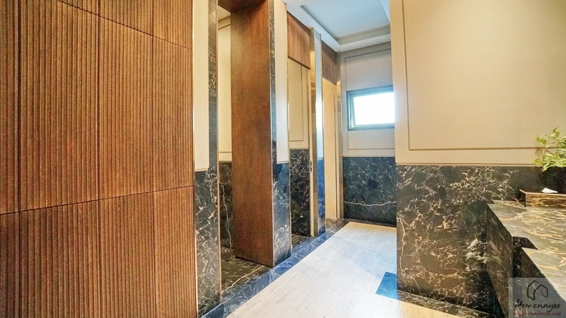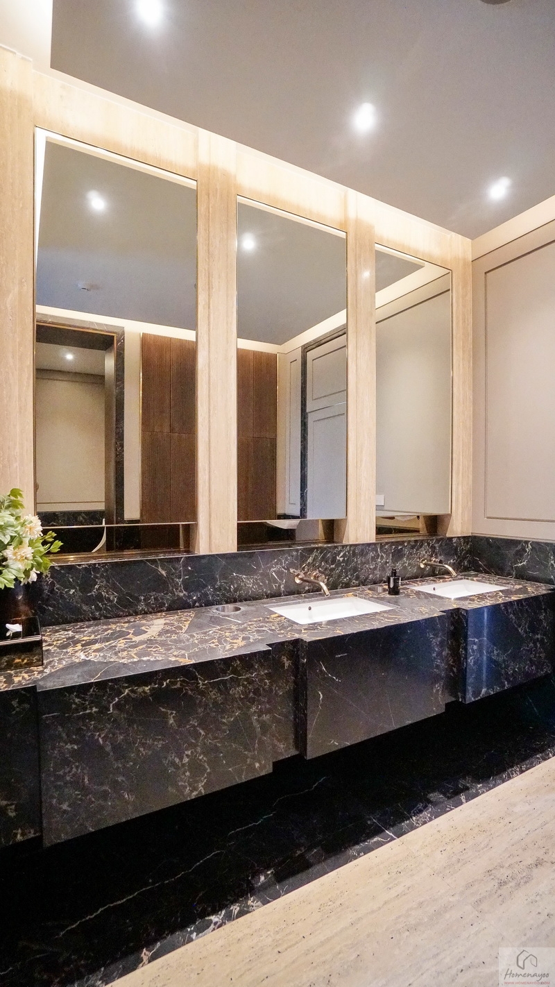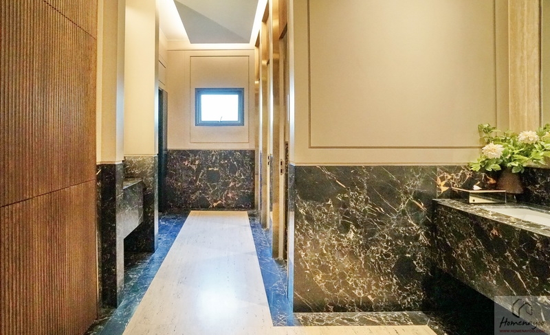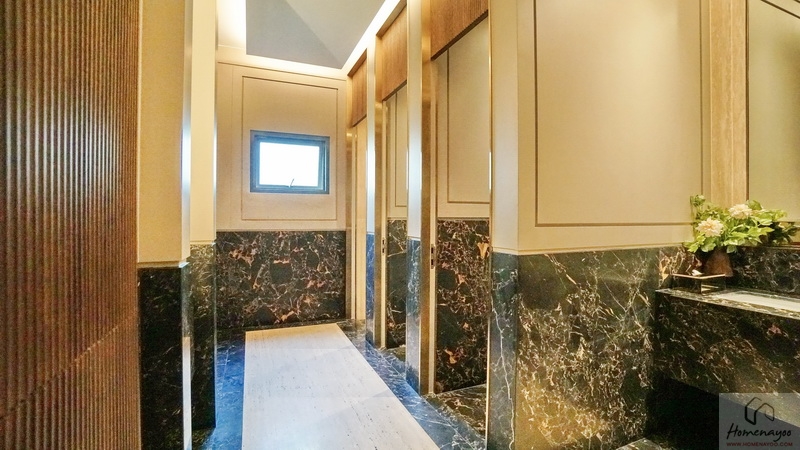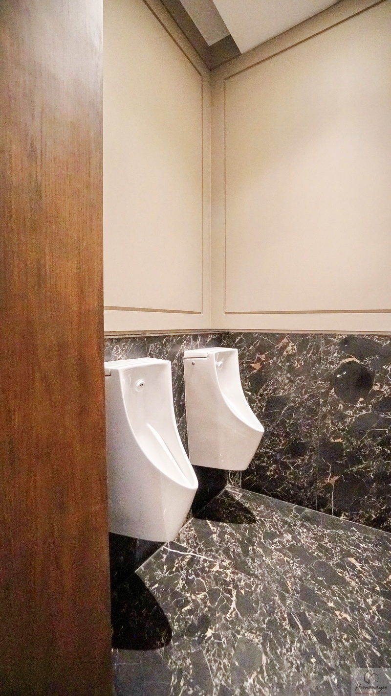 ส่วนห้องน้ำชั้นล่างเป็นแบบ Powder Room คือจะไม่มีส่วนอาบน้ำนั่นเอง ภายในกว้างตกแต่งพื้นด้วยกระเบื้องลวดลายโทนสีขาว-น้ำตาลทอง จัดมุมใช้งานครบครันทั้งโซนอ่างล้างหน้า, โถสุขภัณฑ์ชาย, มุมโถสุขภัณฑ์อัตโนมัติ พร้อมหน้าต่างช่วยระบายอากาศ