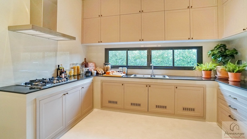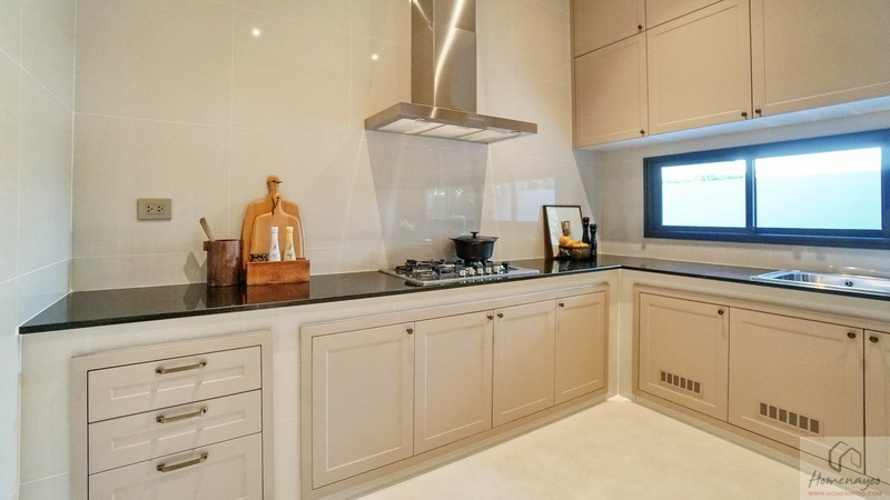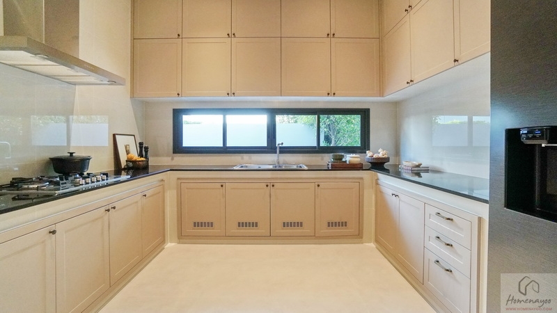 ทางซ้าย Built-in เคาน์เตอร์ครัวแบบ U-Shape หน้าท็อปหินแกรนิตสีดำ ฟังก์ชันครบทั้งส่วนทำอาหาร, ฮูดดูดควัน, ส่วนเตรียมอาหาร และซิงค์ล้างจาน ด้านบน-ล่างมีช่องเก็บของบานปิด ด้านข้างมีที่เหลือให้วางตู้เย็น พร้อมติดตั้งหน้าต่างกระจกบานเลื่อนแนวยาวไว้เปิดช่วยระบายอากาศ