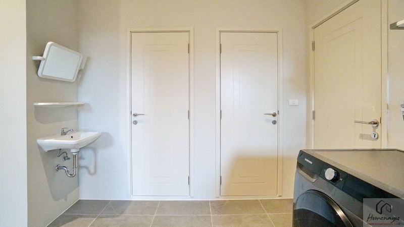 ถัดมาจะเป็นห้องเก็บของและห้องควบคุมระบบไฟฟ้าภายในบ้าน ด้านหน้าติดตั้งอ่างล้างหน้าไว้ให้พร้อมชุดกระจก