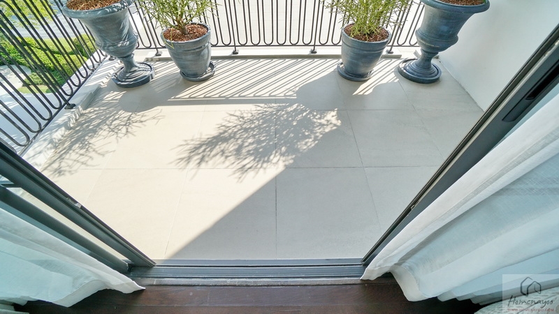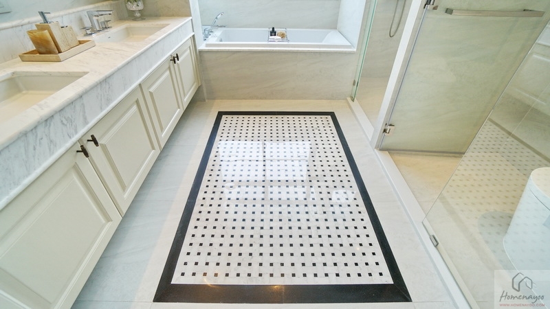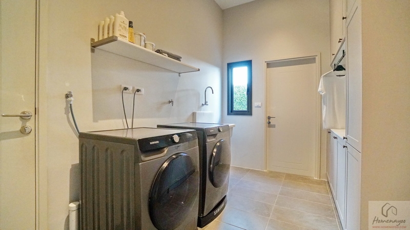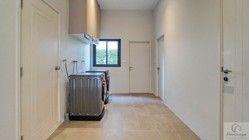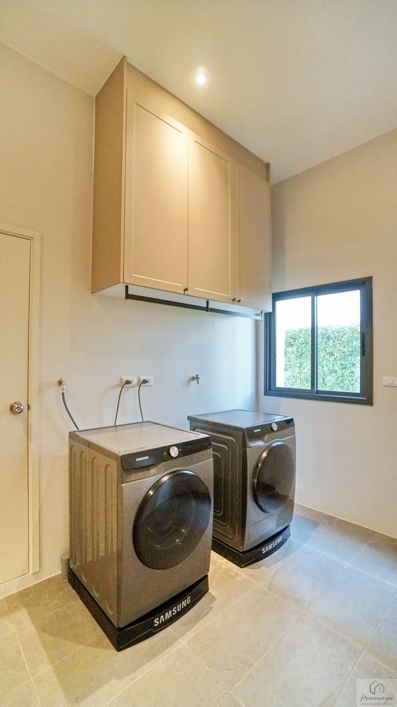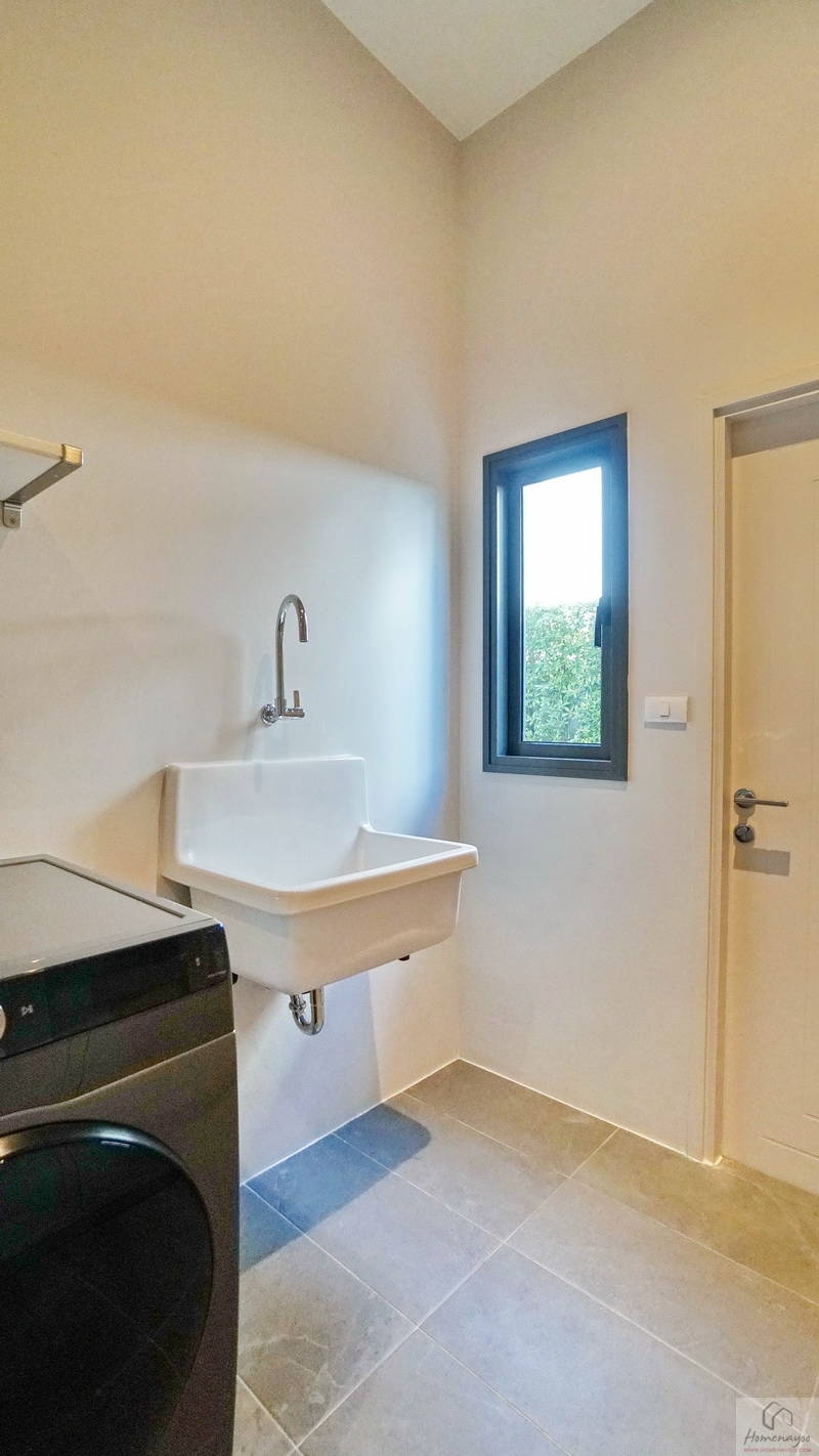 พื้นปูกระเบื้องเซรามิกกันลื่นด้านซ้ายมือสามารถวางเครื่องซักผ้าและเครื่องอบผ้าอย่างละ 1 เครื่องได้เลย