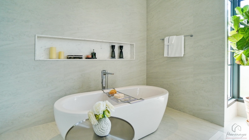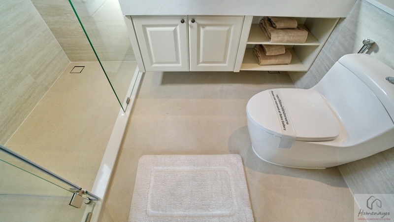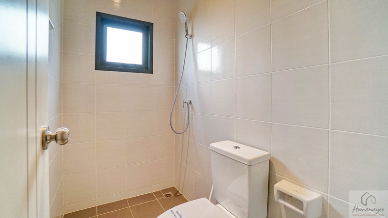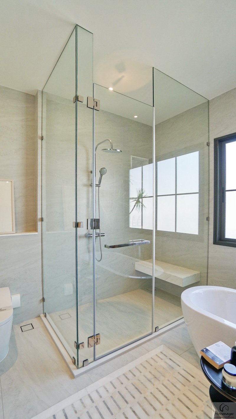 ภายในกว้างใช้งานสะดวกสบาย ตกแต่งกระเบื้องพื้นและผนังด้วยโทนสีสะอาดน่าใช้งาน ฟังก์ชันครบทั้งมุมอ่างล้างหน้าติดตั้งบนตู้เคาน์เตอร์, แขวนตู้เก็บของกระจกเงาบานใหญ่, โถสุขภัณฑ์ 2 Piece ระบบ Daul Flush, ก่อ Low Wall วางของใช้, ราวแขวนผ้าเช็ดตัว, มุมอาบน้ำใช้ฝักบัว Hand Shower, ก่อม้านั่งช่วยอาบน้ำไว้ด้านข้าง, หน้าต่างช่วยระบายอากาศ