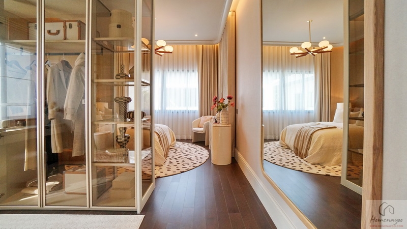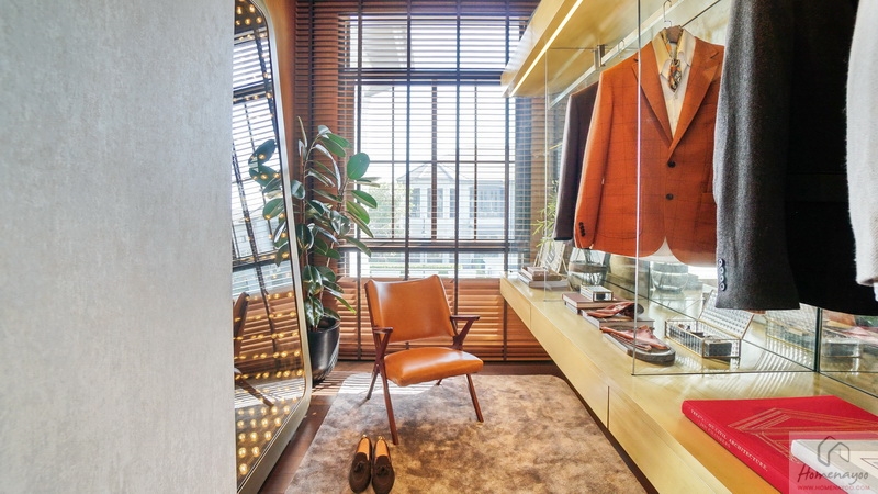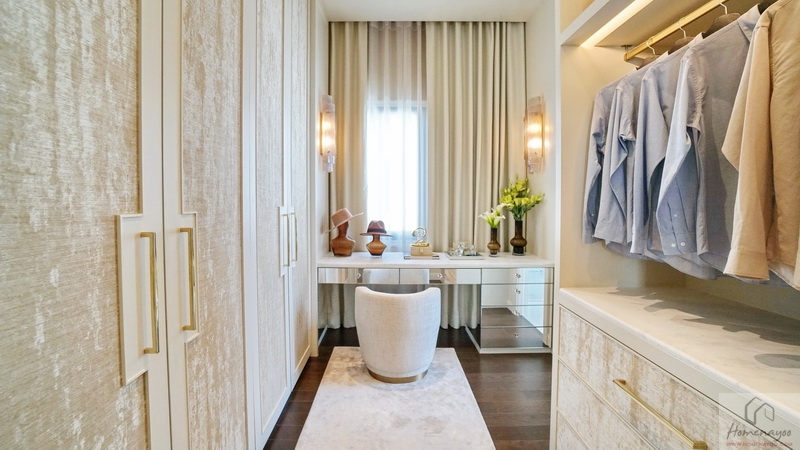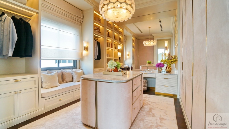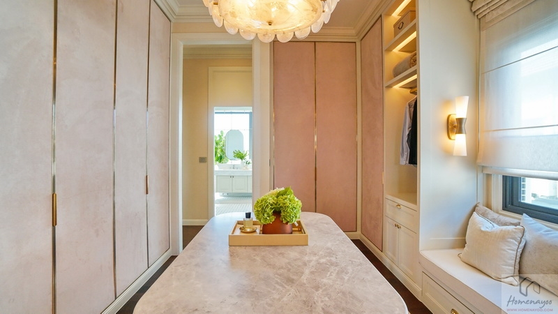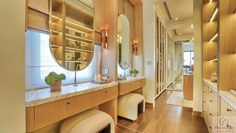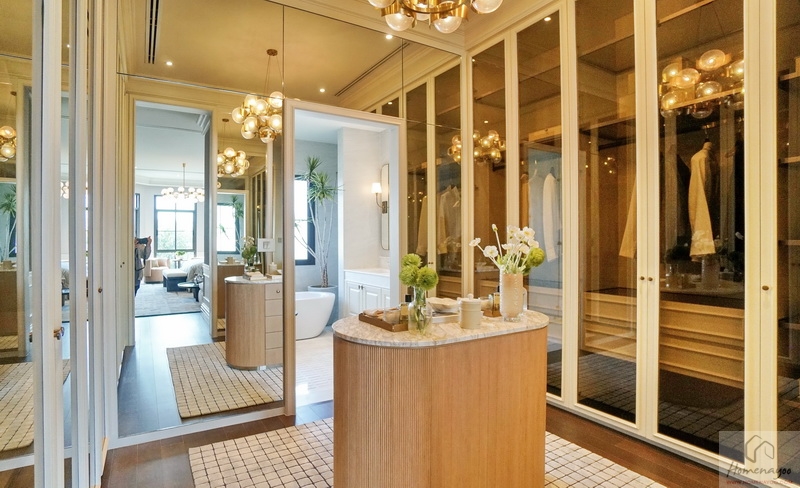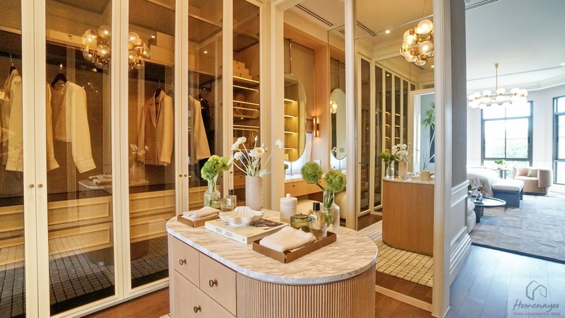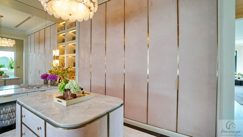 ถัดเข้าไปคือโซน Walk-in Closet พื้นที่ใช้งานเป็นสัดส่วน บ้านตัวอย่างวาง Island เครื่องประดับไว้ตรงกลาง ด้านในจัดเป็นมุมโต๊ะเครื่องแป้ง