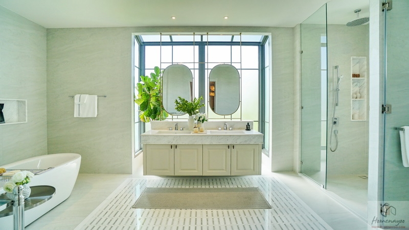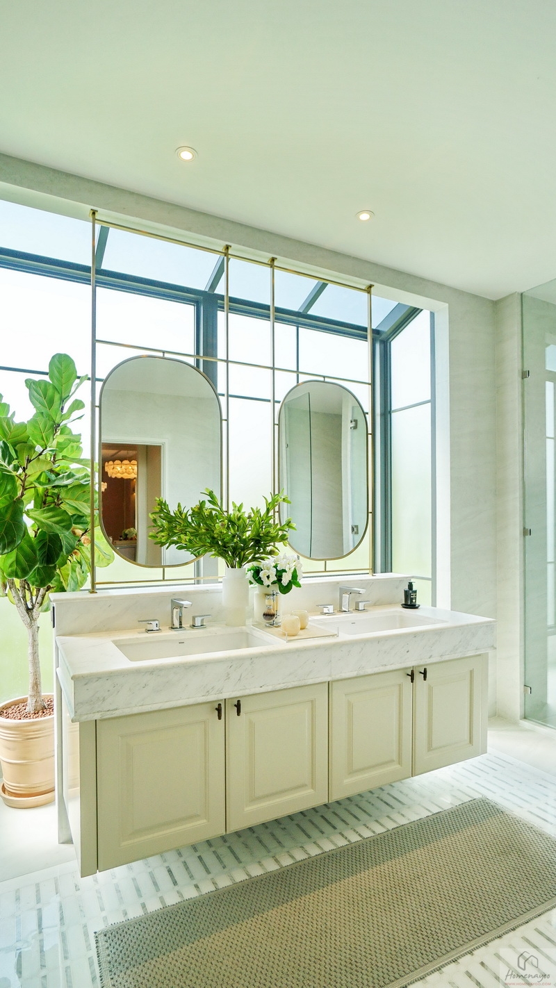 กลางห้องคือโซนอ่างล้างหน้าแบบ His & Her คู่รักใช้งานร่วมกันได้สะดวก อ่างล้างหน้าทรงเหลี่ยมกว้างแบบฝังบนตู้เก็บของสีอ่อน พร้อมกระจกเงาบานใหญ่ทรงสวย 2 ชุด ด้านหลังมีช่องแสงกระจกฝ้าขนาดใหญ่ Oversize พร้อม Sky Light ช่วยรับแสง