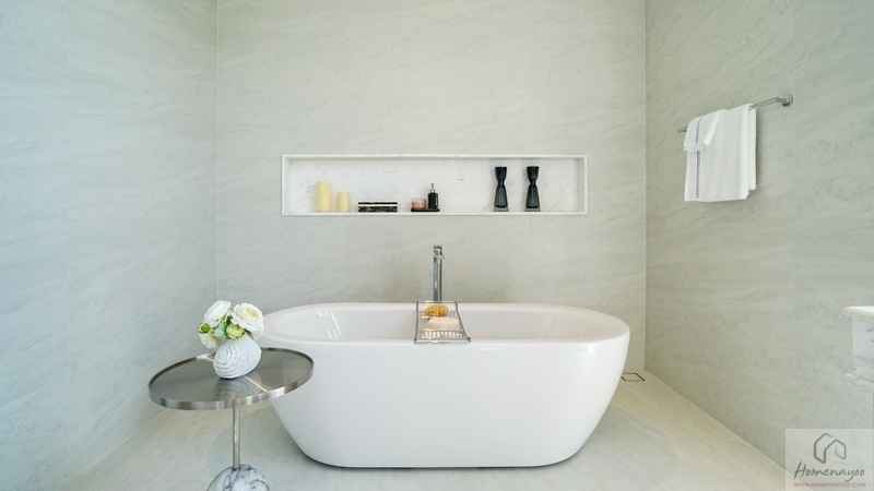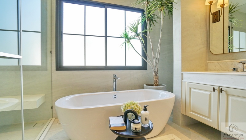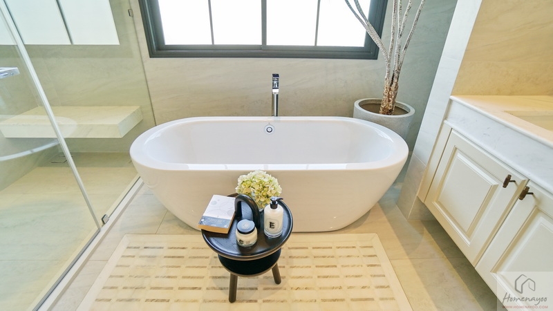ฝั่งซ้ายของห้องเป็นมุมอ่างอาบน้ำแบบ Free Standing ด้านข้างมีที่วางของ, ราวแขวนผ้าขนหนู รวมถึงที่ว่างให้วางของตกแต่งเพิ่มบรรยากาศ อ่างอาบน้ำกว้างใช้งานได้อย่างสะดวก มีก๊อกและฝักบัวมาให้ครบชุด