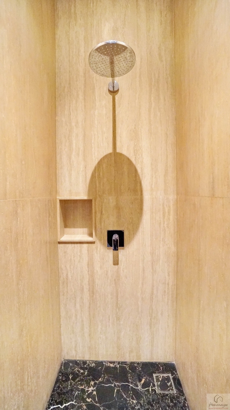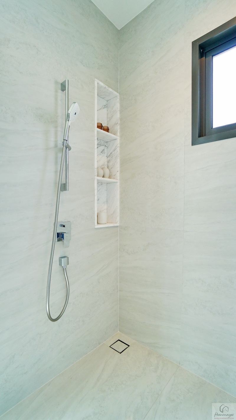 ใกล้กันเป็นมุมอาบน้ำที่ทางโครงการติดตั้ง Shower Box มาให้เรียบร้อย พื้นที่ใช้งานด้านในกว้างกำลังดี ติดตั้งฝักบัว Hand Shower พร้อมราวปรับระดับสูง-ต่ำ ด้านข้างเจาะผนังทำเป็นที่วางของใช้ให้ 3 Step
