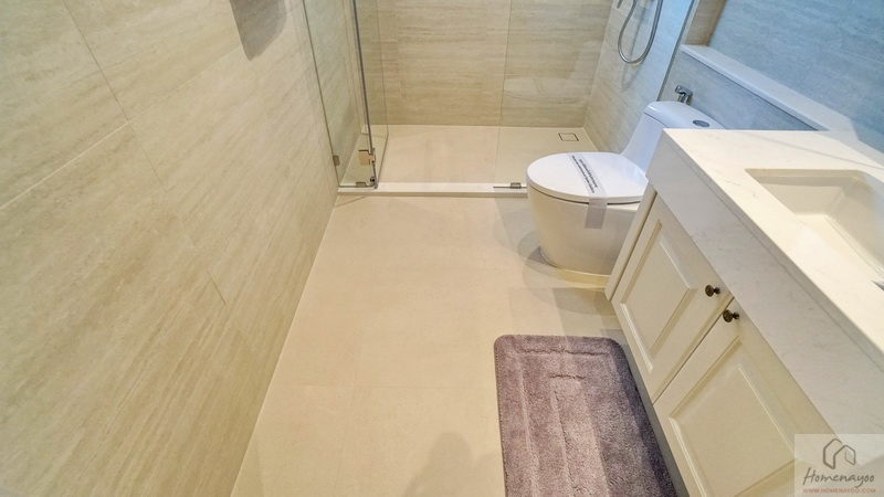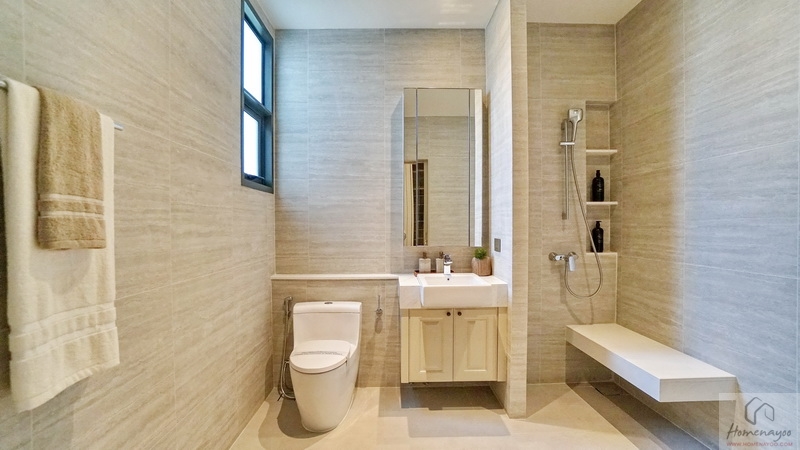 ขณะที่ห้องน้ำในตัวตกแต่งมาในโทนสีอ่อนเช่นกัน แยกส่วนแห้ง-ส่วนเปียกด้วย Shower Screen ฟังก์ชันครบทั้งโซนอ่างล้างหน้าทรงเหลี่ยมมีตู้เก็บของด้านล่าง, กระจกเงาบานใหญ่, มุมโถสุขภัณฑ์ 2 Piece ระบบ Dual Flush, ราวแขวนผ้าเช็ดตัว, มุมฝักบัว Hand Shower และหน้าต่างกระจกฝ้าช่วยระบายอากาศ 1 ชุด