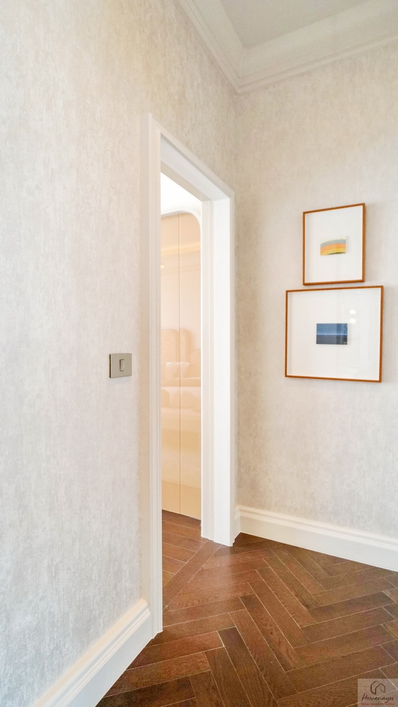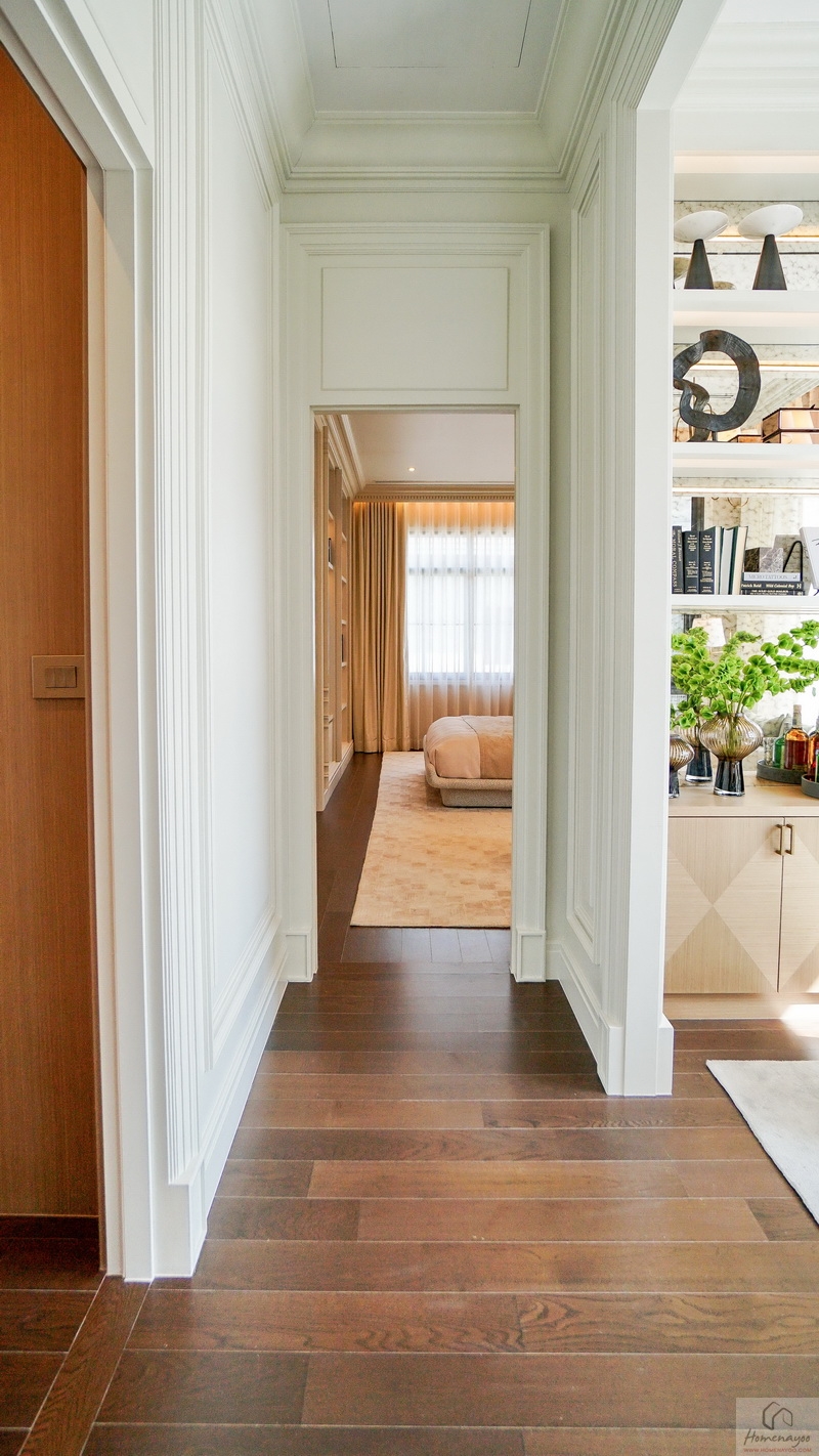 ขึ้นมาชั้น 2 ของตัวบ้าน ฝ้าเพดานสูงอยู่ที่ 3.2 ม. ปูพื้นด้วย Engineered Wood ได้ Mood & Tone ที่ผ่อนคลายสบายตา มีโถงทางเดินแนวยาวเชื่อมไปยังห้องต่าง ๆ ใกล้กับบันไดห้องฝั่งหน้าบ้านจะเป็น Tea Room