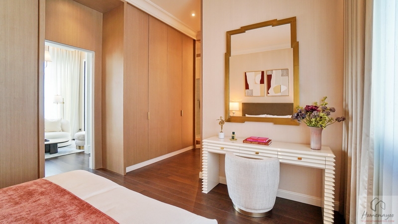 อีกฝั่งของห้องคือโซน Walk-in Closet ตรงกลางวางโต๊ะเครื่องแป้งขนาดมาตรฐานไว้ชิดช่องแสงขนาดใหญ่ ผนังด้านข้าง Built-in ตู้เสื้อผ้าบานเปิดสวย ๆ ไว้ 2 ชุด พื้นด้านล่างเหลือให้ใช้งานได้อย่างคล่องตัว