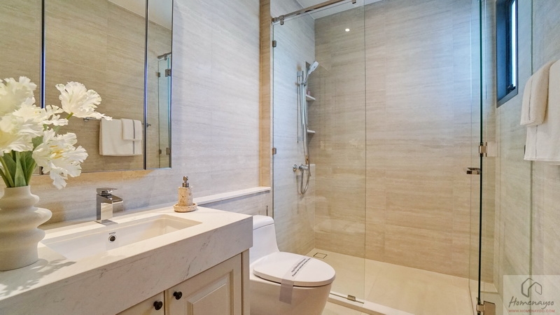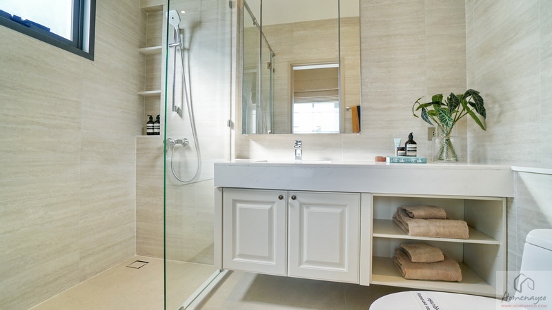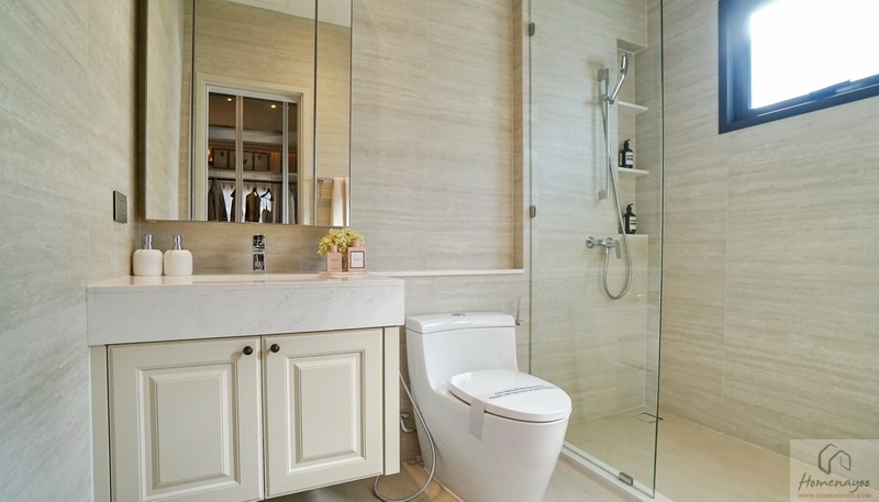 ห้องน้ำในตัวตกแต่งมาในโทนสีอ่อน ๆ แยกส่วนแห้ง-ส่วนเปียกด้วย Shower Screen ฟังก์ชันครบทั้งโซนอ่างล้างหน้าทรงเหลี่ยมมีตู้เก็บของด้านล่าง, กระจกเงาบานใหญ่พิเศษ, มุมโถสุขภัณฑ์ 2 Piece ระบบ Dual Flush, ราวแขวนผ้าเช็ดตัว, มุมฝักบัว Hand Shower และหน้าต่างกระจกฝ้าช่วยระบายอากาศ