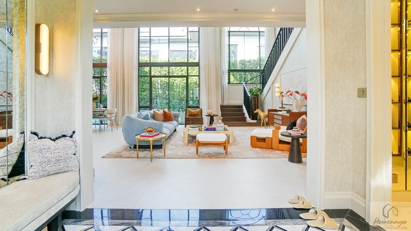 ข้างโถงบันไดสามารถจัดเป็นมุมนั่งเล่นได้อีก บ้านตัวอย่างวางชุดที่นั่งจากแบรนด์ Poltrona Frau โดยเลือกใช้โทนสีเทาฟ้าเพื่อให้รู้สึกสบายตา