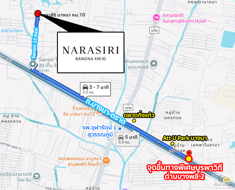 โครงการอยู่ใกล้จุดขึ้นทางพิเศษบูรพาวิถี ด่านบางพลี 2 ฝั่งขาออก ที่ขับรถจากโครงการไปประมาณ 3.3 กม.* หรือประมาณ 5-7 นาที* ใช้มุ่งหน้าไปบางพลี, บางบ่อ, บางเสาธง, บางปะกง, โซนนิคมฯ อุตสาหกรรม เชื่อมต่อภาคตะวันออกไปสถานที่ติดทะเลอย่างชลบุรี, พัทยา, บางแสน, ระยอง, จันทบุรี