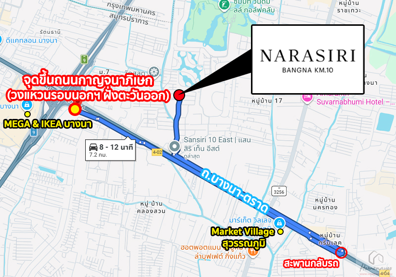 ⇒ การเดินทางโดยรถส่วนตัว : การเดินทางด้วยรถยนต์ส่วนตัวถือเป็นจุดแข็งสำคัญของโครงการนี้ ตัวโครงการตั้งอยู่บนถนนบางนา-ตราดฝั่งขาออก ซึ่งเป็นเส้นหลักที่เชื่อมต่อกรุงเทพฯ ฝั่งตะวันออกกับจังหวัดรอบนอก ทำให้การเดินทางเข้า-ออกเมือง สามารถเลือกใช้เส้นทางได้หลากหลาย ปรับตามช่วงเวลาการจราจรได้อย่างยืดหยุ่น