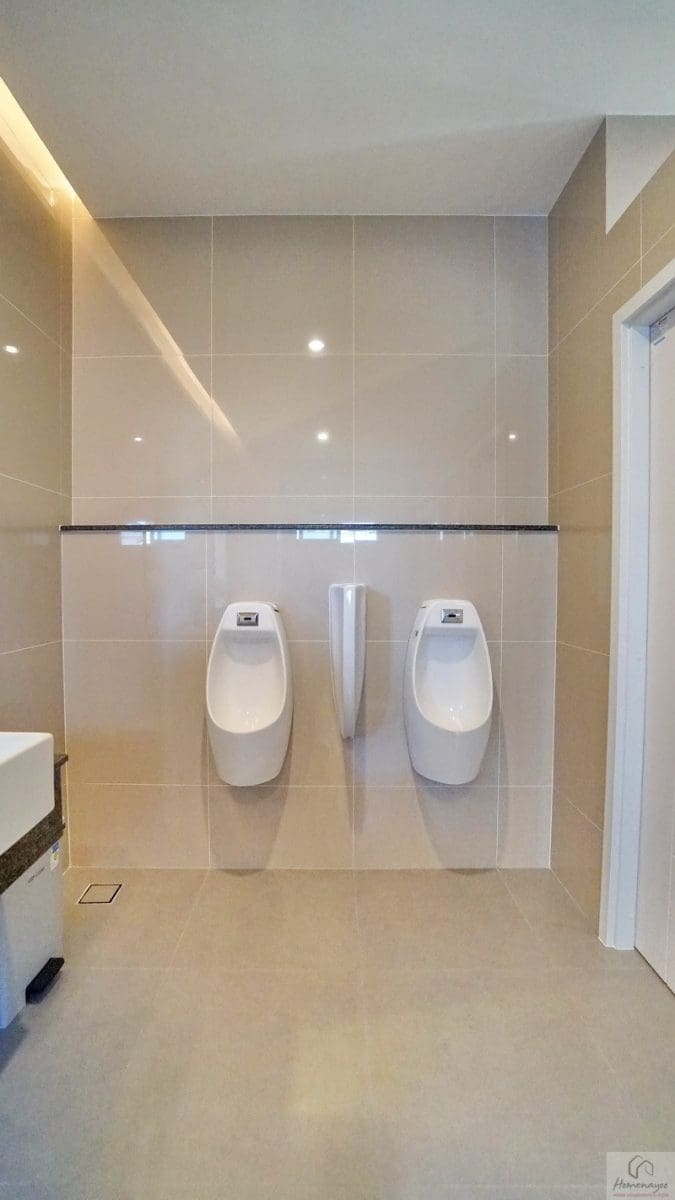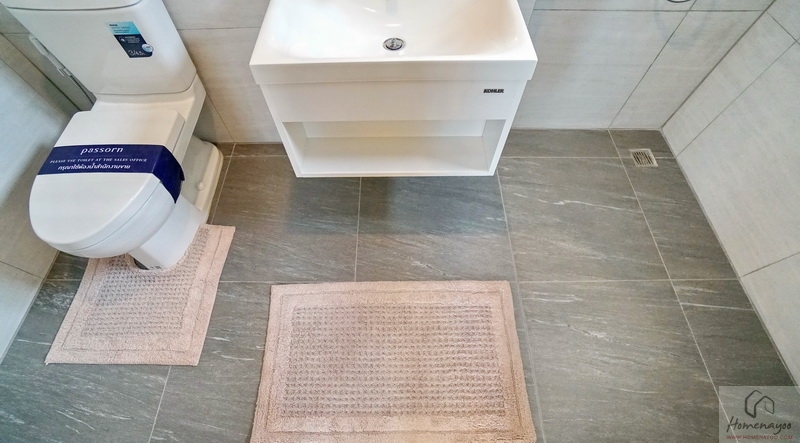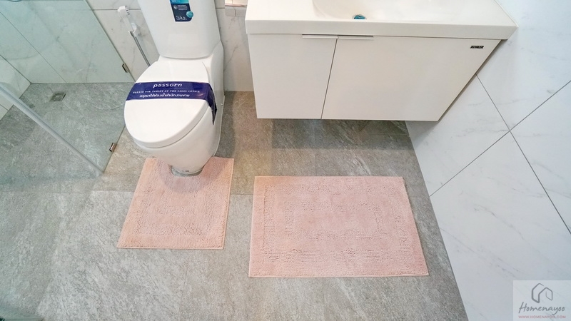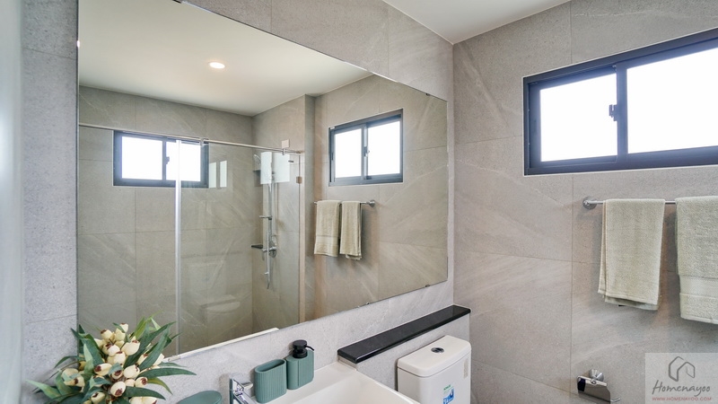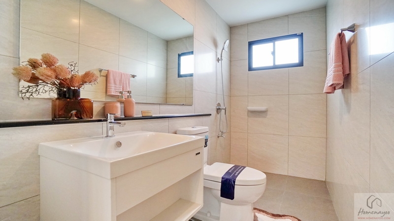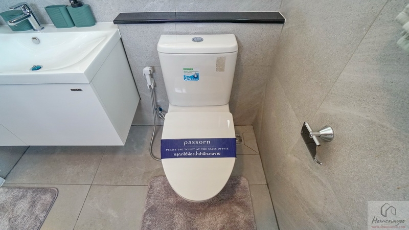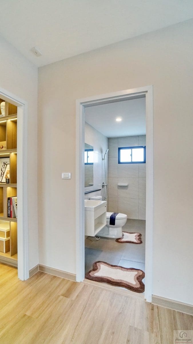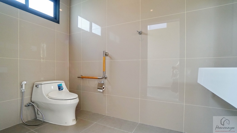 ภายในฟังก์ชันครบครันตกแต่งด้วยโทนสีขาว-เทา ปูพื้นและผนังกระเบื้องเซรามิกสวยงาม พื้นทางเข้าอยู่ในระนาบเดียวกับพื้นบ้าน ผู้ใช้ Wheelchair สามารถเข้าใช้งานได้สะดวก สุขภัณฑ์มาตรฐานใช้ของ Kohler, Englefield หรือเทียบเท่า มีหน้าต่างบานกระทุ้งกระจกฝ้าช่วยระบายอากาศให้ 1 จุด
