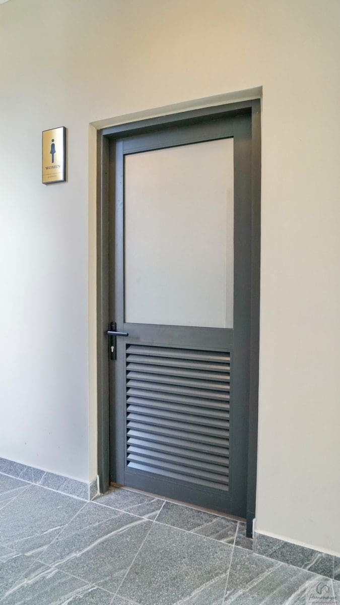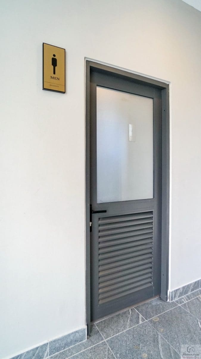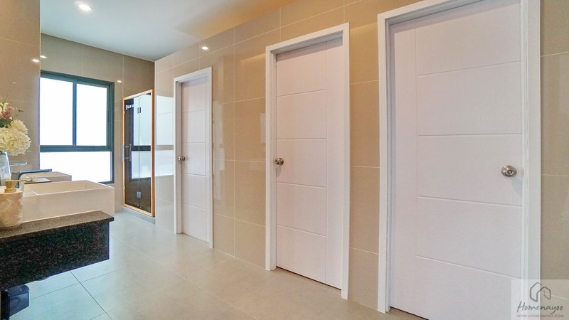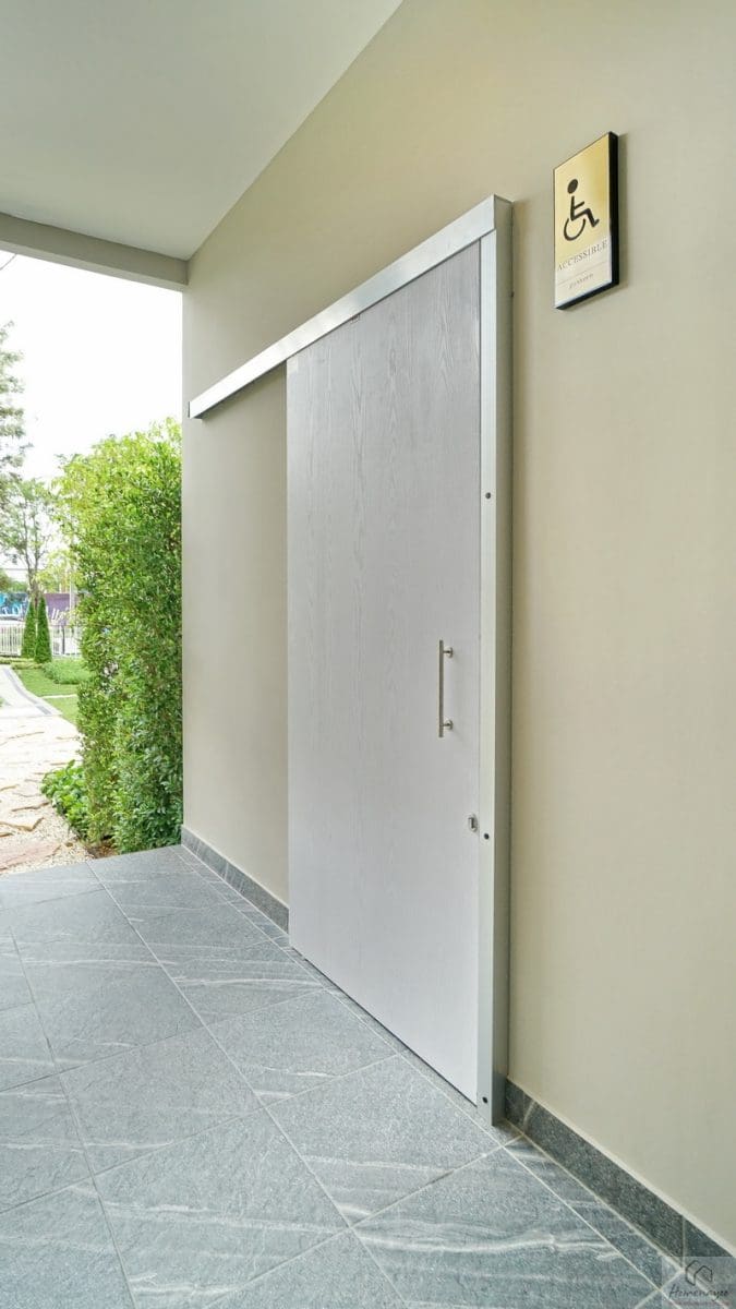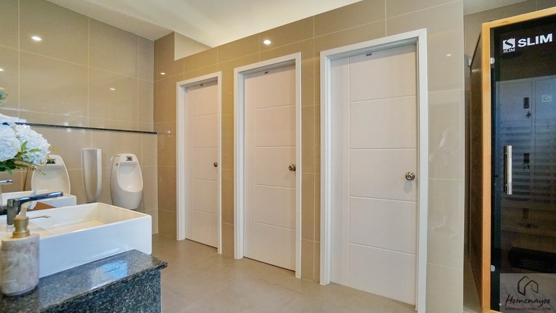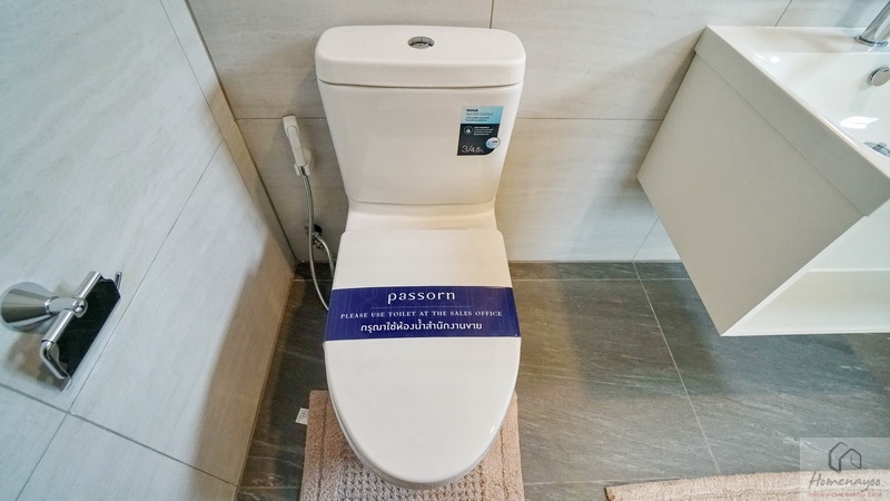 ภายในฟังก์ชันครบครันตกแต่งด้วยโทนสีขาว-เทา ปูพื้นและผนังกระเบื้องเซรามิกสวยงาม พื้นทางเข้าอยู่ในระนาบเดียวกับพื้นบ้าน ผู้ใช้ Wheelchair สามารถเข้าใช้งานได้สะดวก สุขภัณฑ์มาตรฐานใช้ของ Kohler, Englefield หรือเทียบเท่า มีหน้าต่างบานกระทุ้งกระจกฝ้าช่วยระบายอากาศให้ 1 จุด