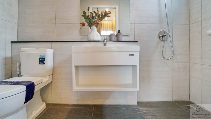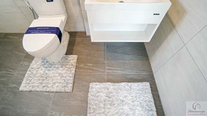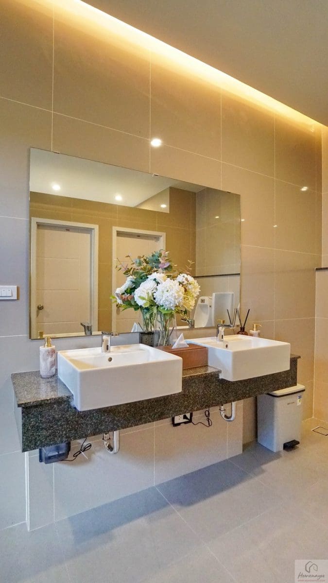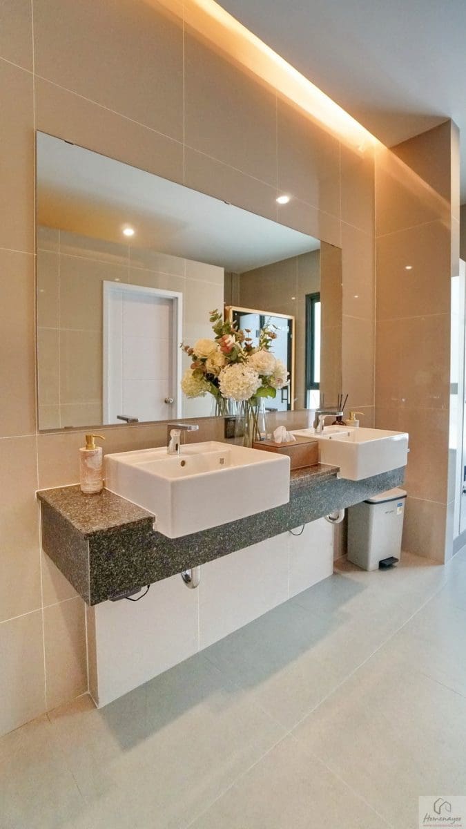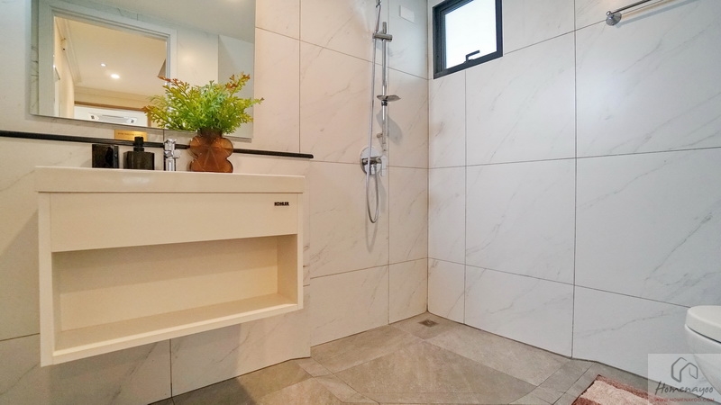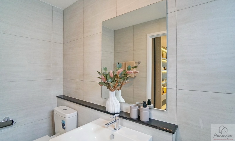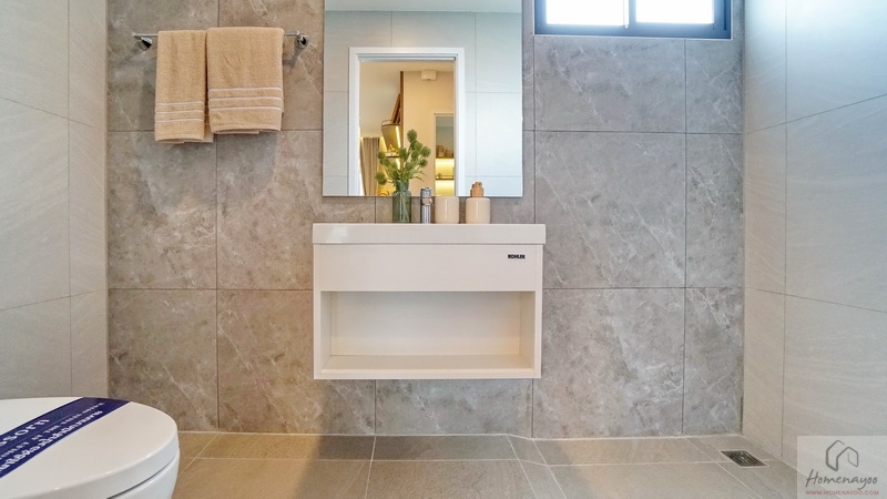 ภายในเป็นห้องหน้ากว้างตกแต่งด้วยกระเบื้องเซรามิกสีขาว-เทา สุขภัณฑ์มาตรฐานใช้ของ Kohler, Englefield หรือเทียบเท่า จัดมุมใช้งานต่าง ๆ ไว้อย่างลงตัว ไม่ว่าจะเป็น เคาน์เตอร์อ่างล้างหน้า, กระจกเงาบานใหญ่, ก่อ Low Wall วางของใช้หรือของตกแต่งได้อีกเยอะ
