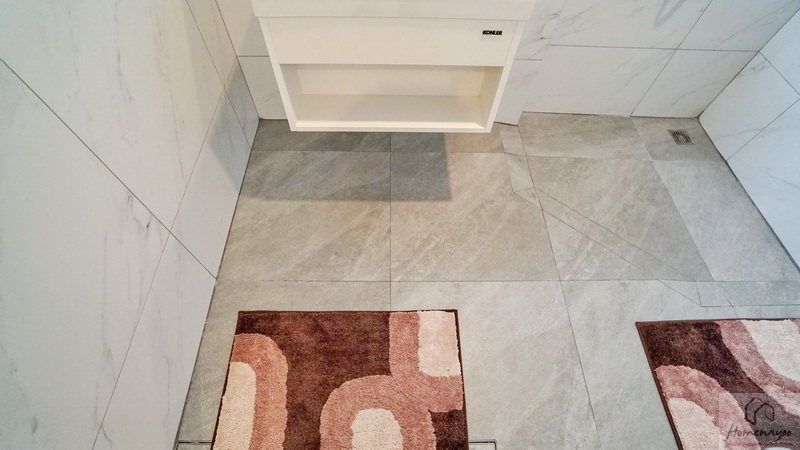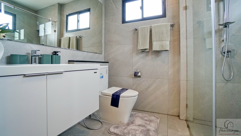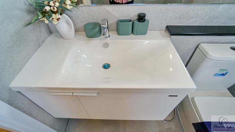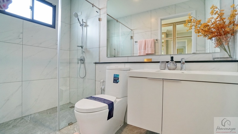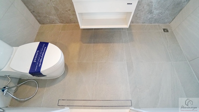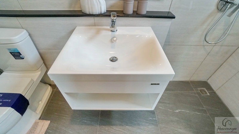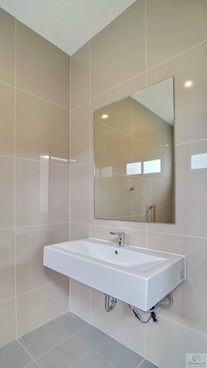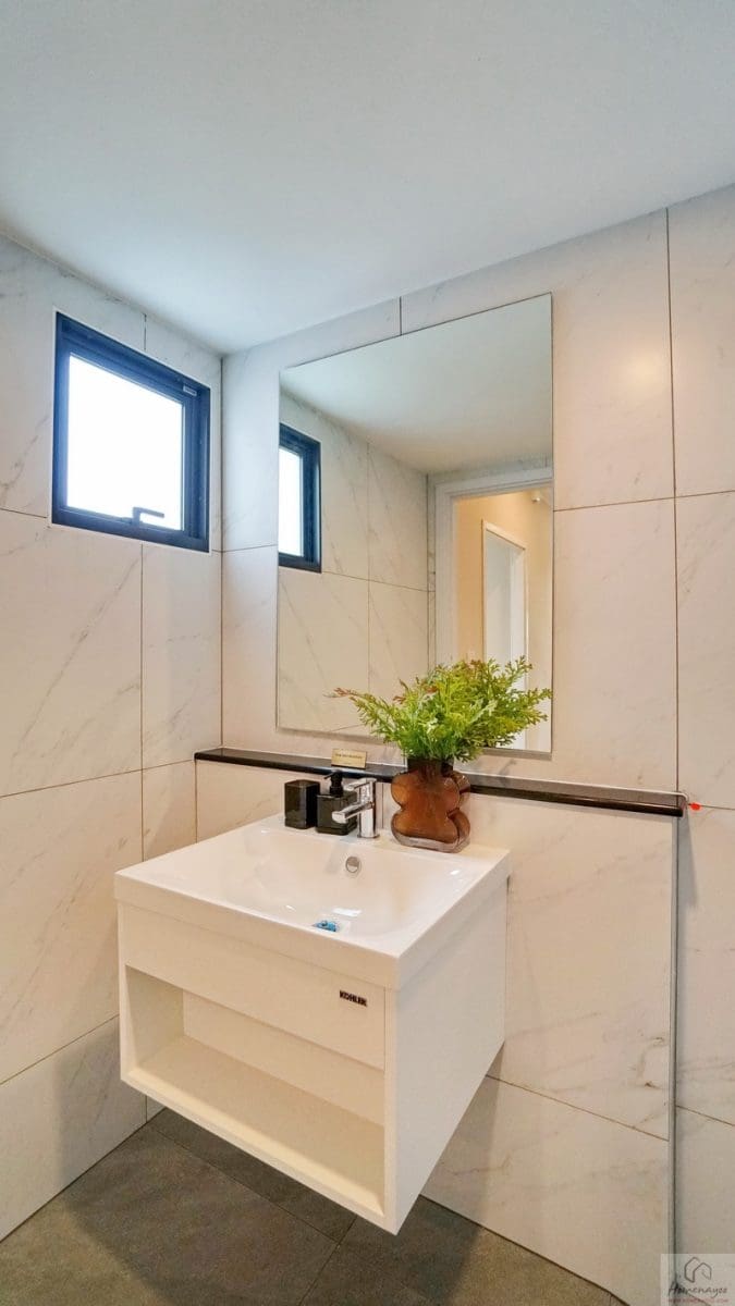 ภายในเป็นห้องหน้ากว้างตกแต่งด้วยกระเบื้องเซรามิกสีขาว-เทา สุขภัณฑ์มาตรฐานใช้ของ Kohler, Englefield หรือเทียบเท่า จัดมุมใช้งานต่าง ๆ ไว้อย่างลงตัว ไม่ว่าจะเป็น เคาน์เตอร์อ่างล้างหน้า, กระจกเงาบานใหญ่, ก่อ Low Wall วางของใช้หรือของตกแต่งได้อีกเยอะ