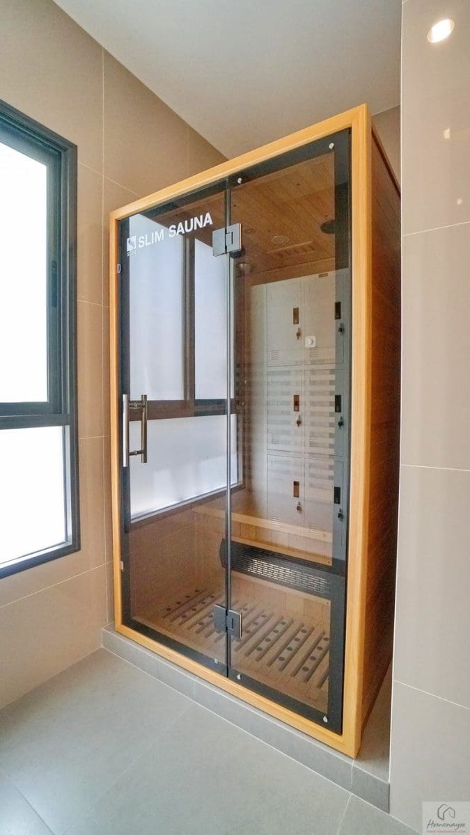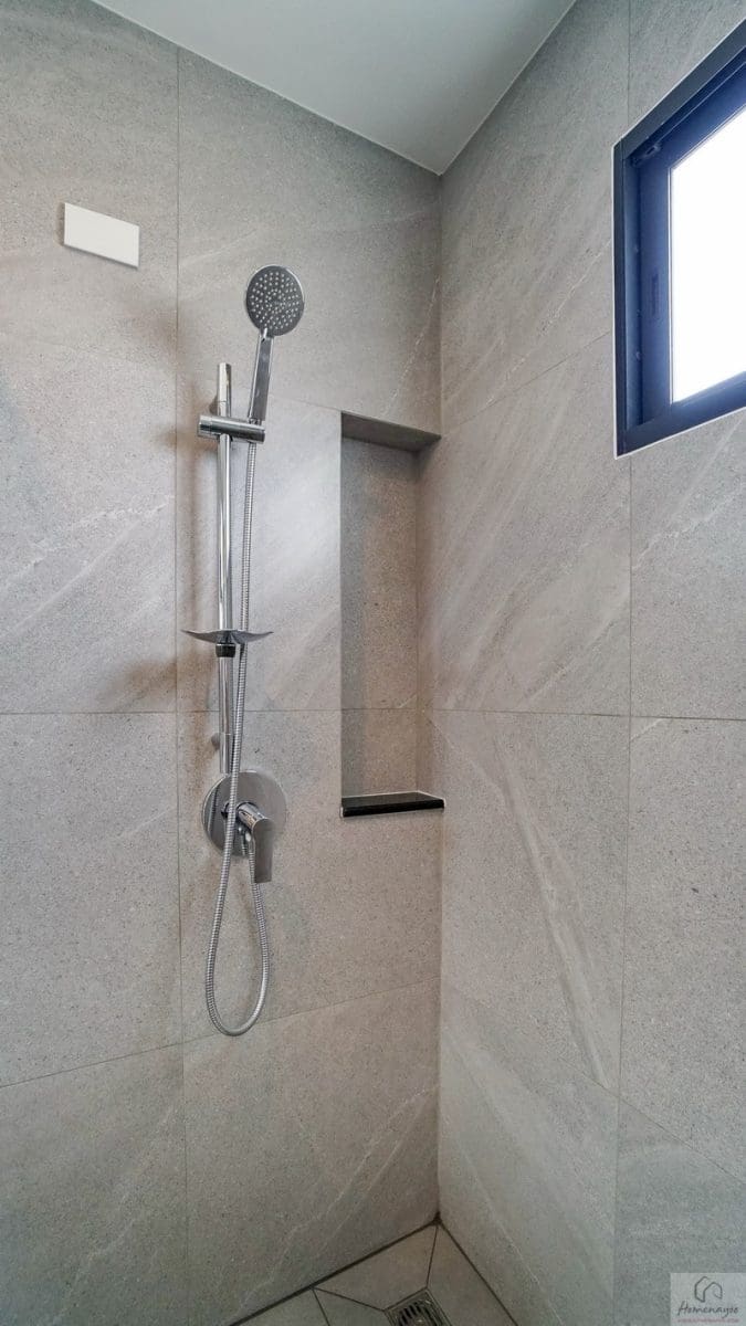 มุมอาบน้ำด้านในใช้ฝักบัว Hand Shower มีราวปรับระดับสูง-ต่ำและชั้นวางสบู่ในตัว ด้านข้างเจาะผนังทำเป็นชั้นวางของใช้ต่าง ๆ พร้อมเดินงานระบบไฟฟ้ามี Junction Box รองรับการติดตั้งเครื่องทำน้ำอุ่นมาให้เรียบร้อย