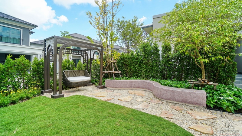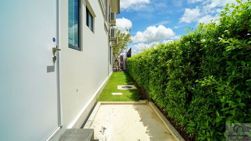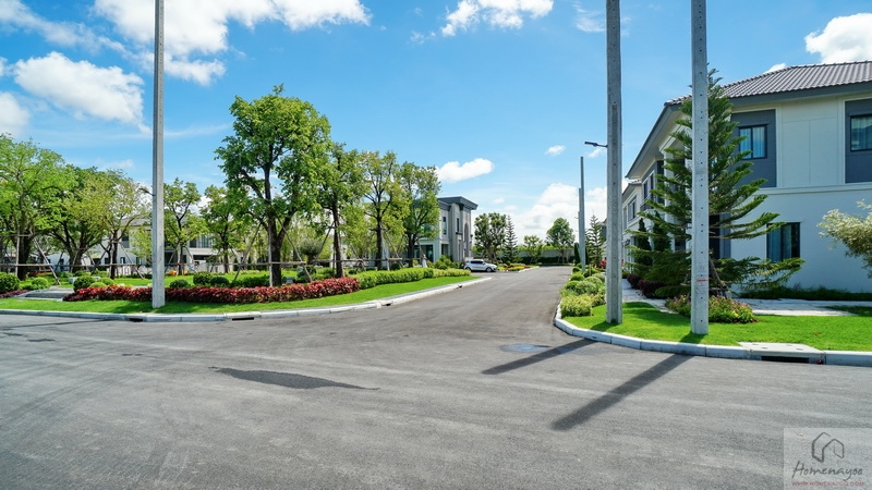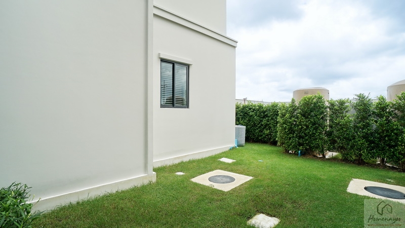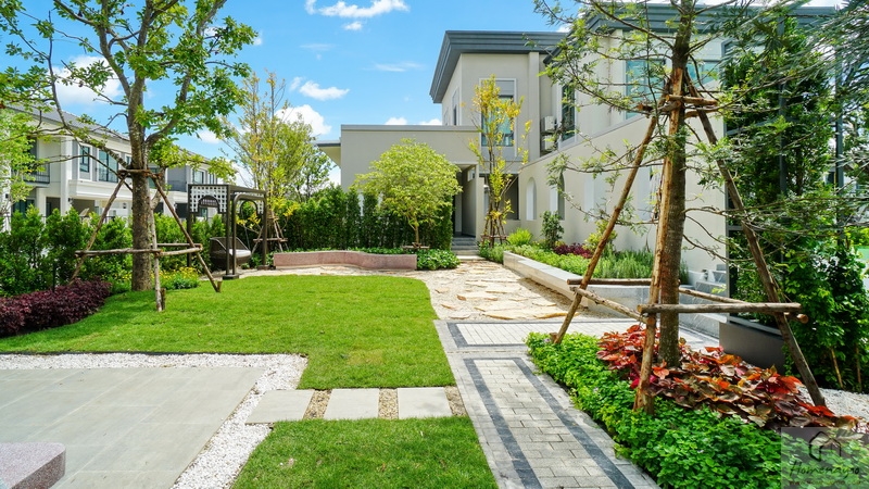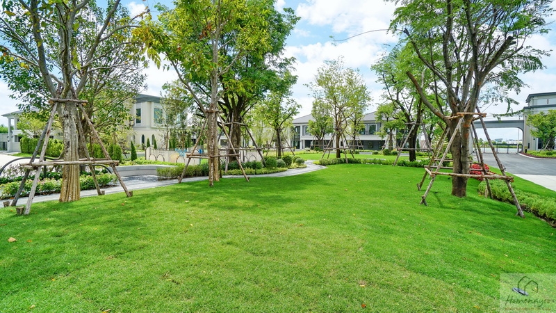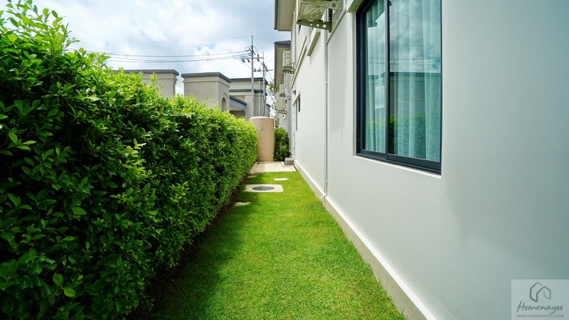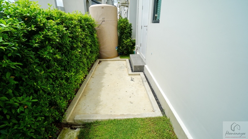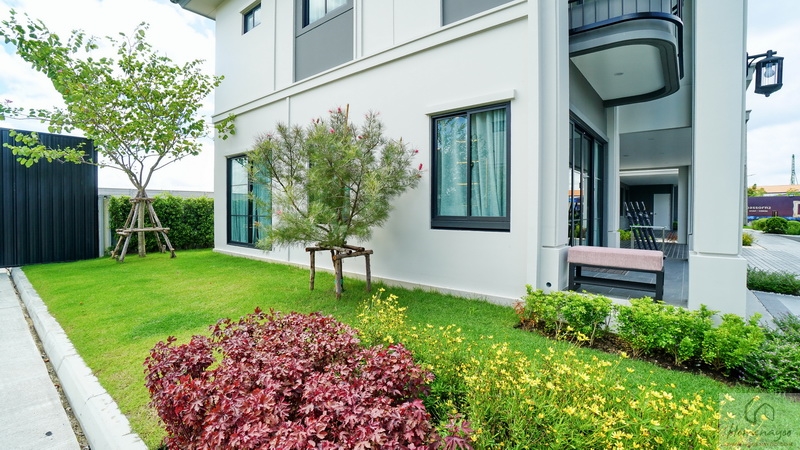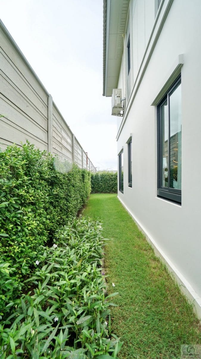 บ้านตัวอย่างปูพื้นสนามหญ้า ตกแต่งด้วยพุ่มไม้สวย ๆ ตลอดแนวกำแพง ลงต้นไม้ใหญ่ให้ความร่มรื่น สามารถเดินเชื่อมไปข้างตัวบ้านได้ทั้ง 2 ฝั่ง บ้านมาตรฐานติดตั้งแทงค์น้ำและปั๊มน้ำให้พร้อมใช้งาน