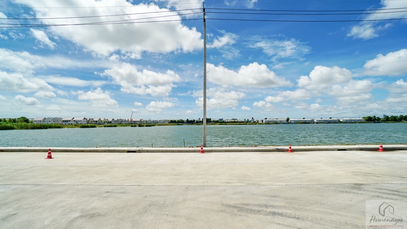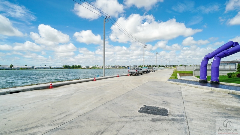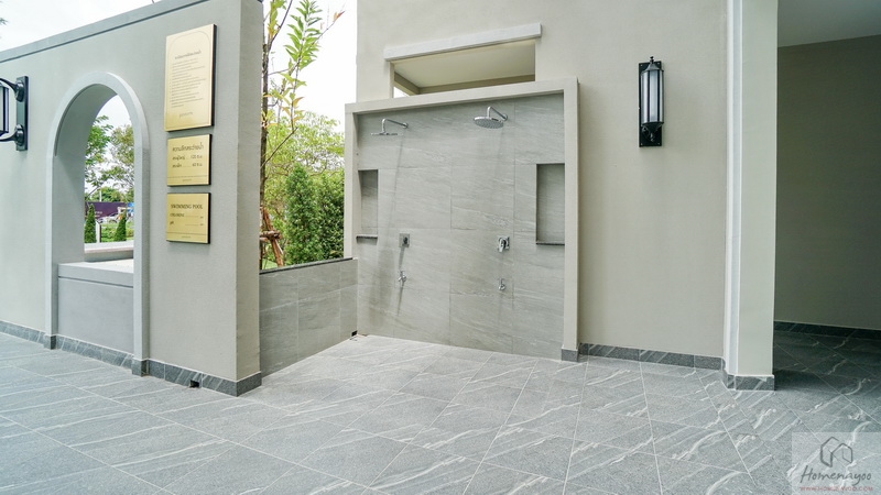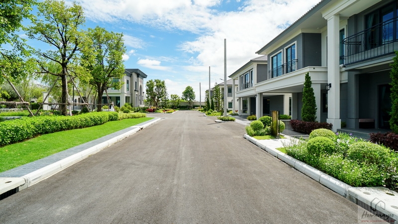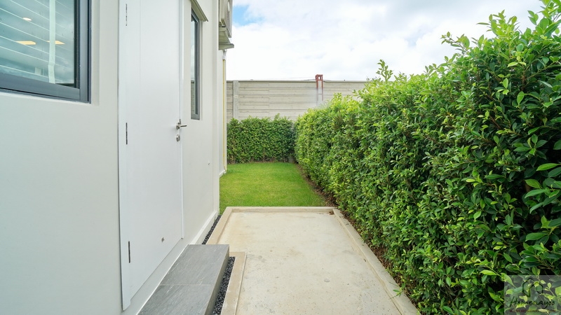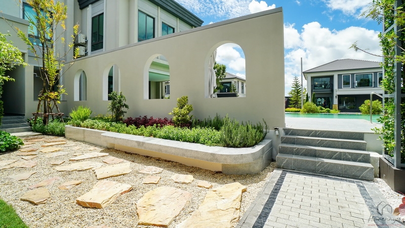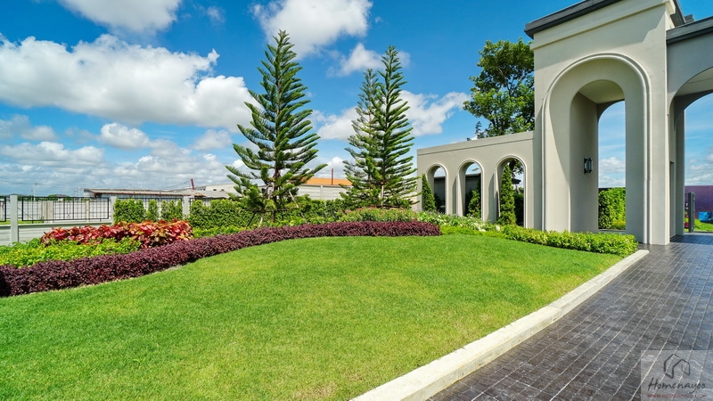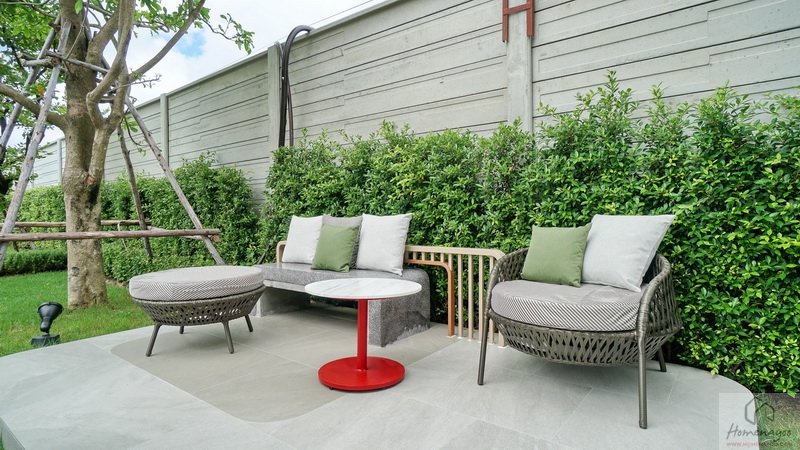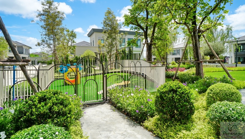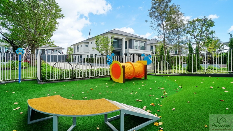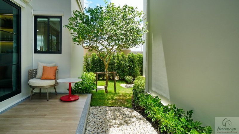บ้านตัวอย่างปูพื้นสนามหญ้า ตกแต่งด้วยพุ่มไม้สวย ๆ ตลอดแนวกำแพง ลงต้นไม้ใหญ่ให้ความร่มรื่น สามารถเดินเชื่อมไปข้างตัวบ้านได้ทั้ง 2 ฝั่ง บ้านมาตรฐานติดตั้งแทงค์น้ำและปั๊มน้ำให้พร้อมใช้งาน