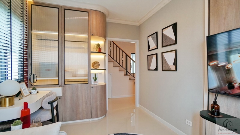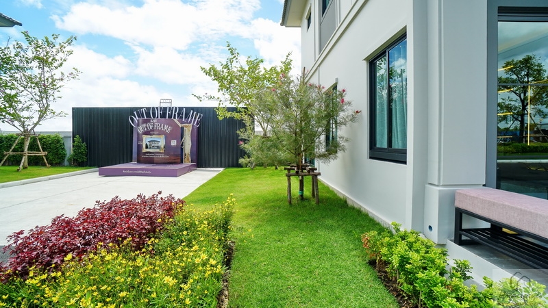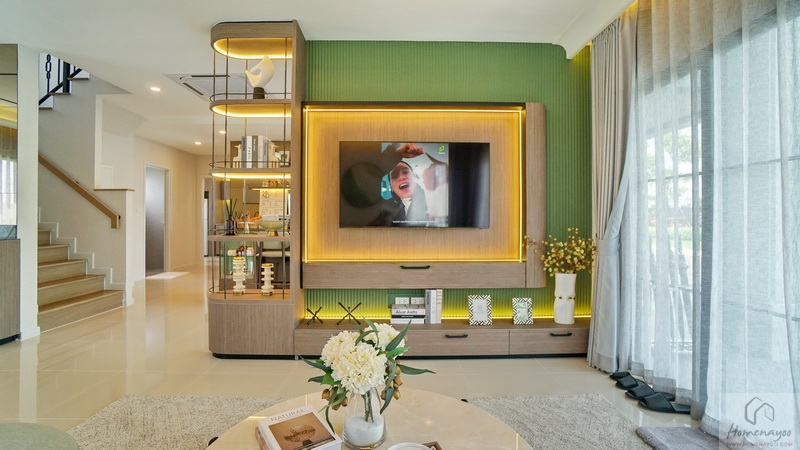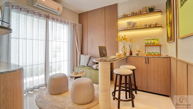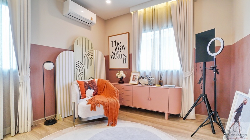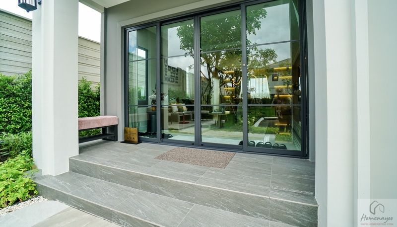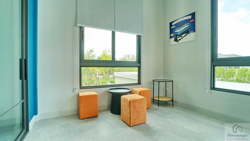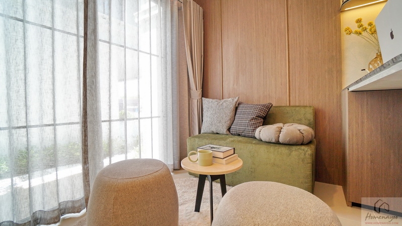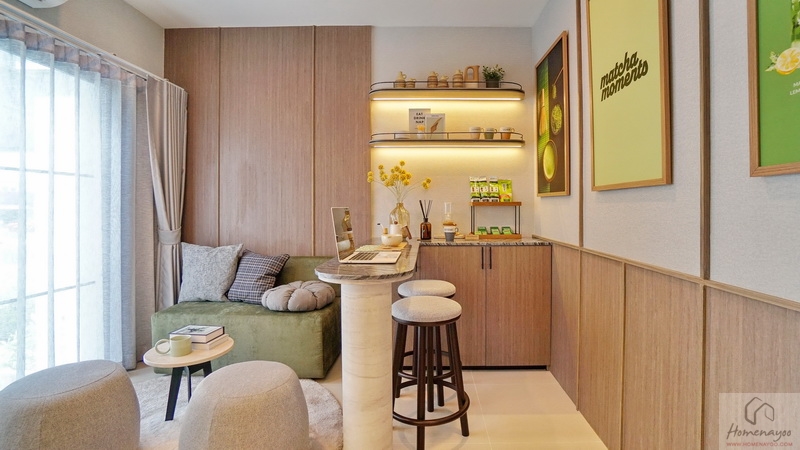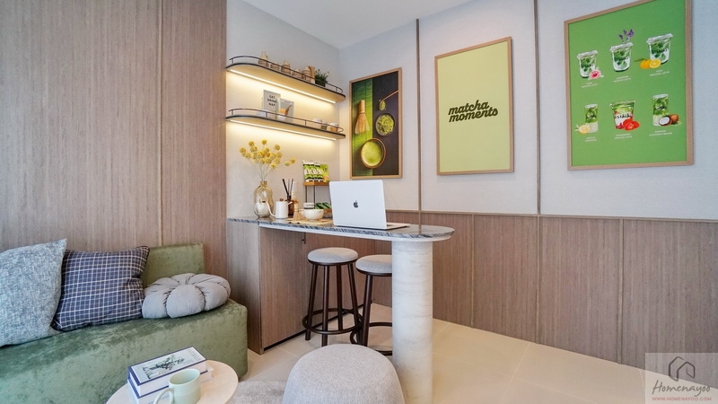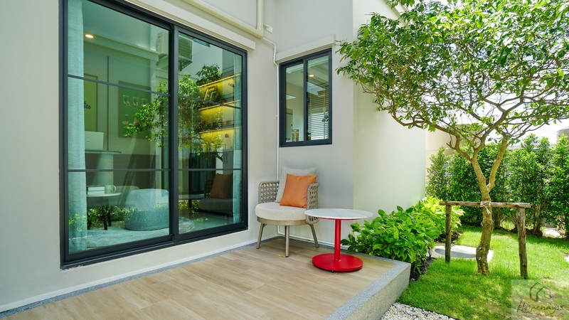 ส่วนบ้านตัวอย่างจัดเป็นห้องพักผ่อนที่มีมุมโต๊ะทำงาน และมุมเครื่องดื่มให้ดูเป็นไอเดีย จุดเด่นคือมีประตูบานเลื่อนเปิดเชื่อมกับสวนข้างตัวบ้านได้