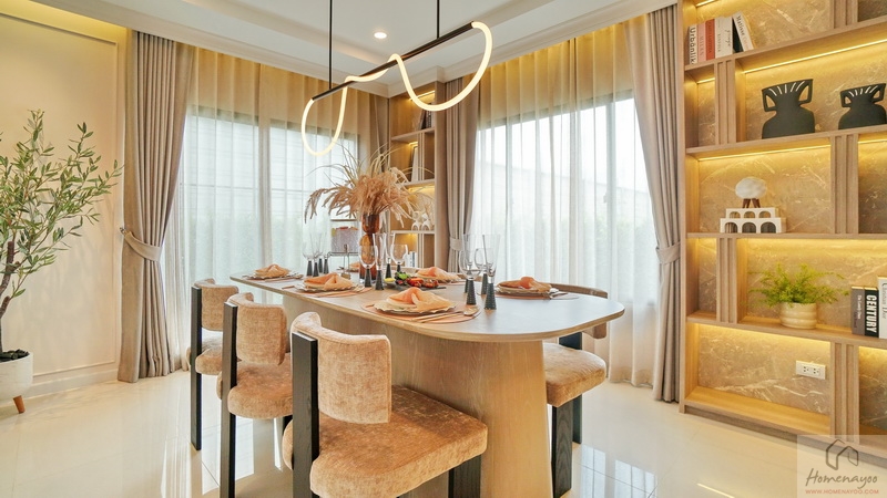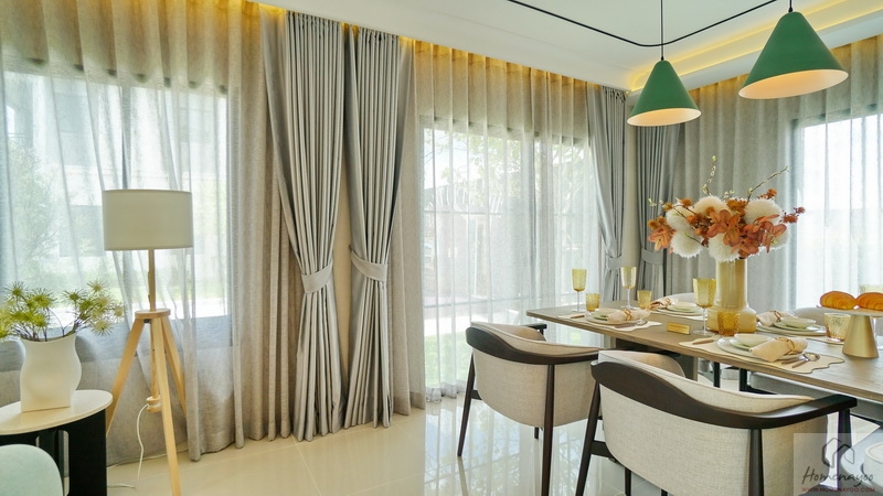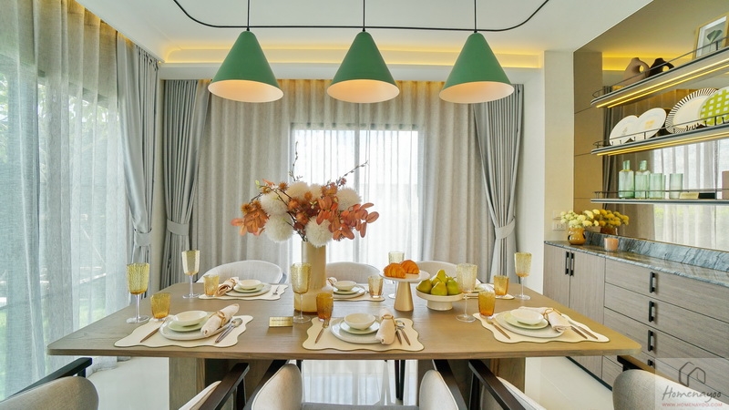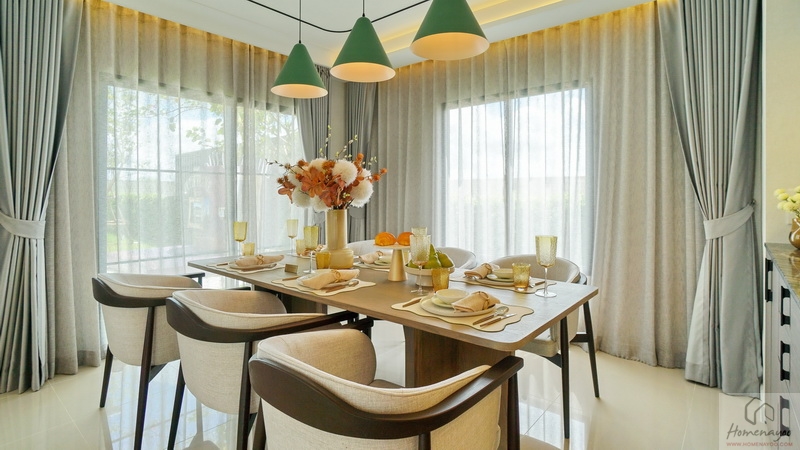 ถัดจาก Living Area ต่อเนื่องไปคือ Dining Area ได้พื้นที่เปิดโล่งเชื่อมต่อกัน ด้านข้างมีประตูกระจกบานเลื่อนเปิดออกไปยังสวนข้างตัวบ้านได้ ระหว่างพื้นที่มีที่เหลืออยู่กำลังดี จะเพิ่มเป็นชุดโต๊ะทำงานก็ตอบโจทย์