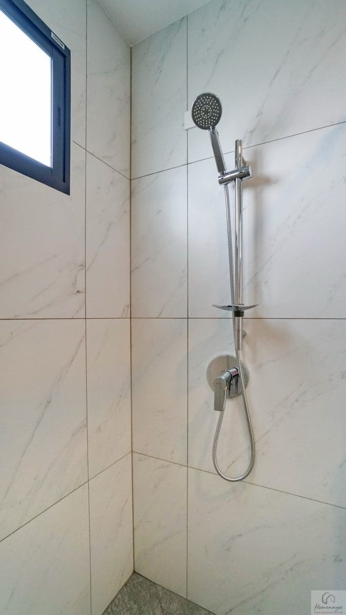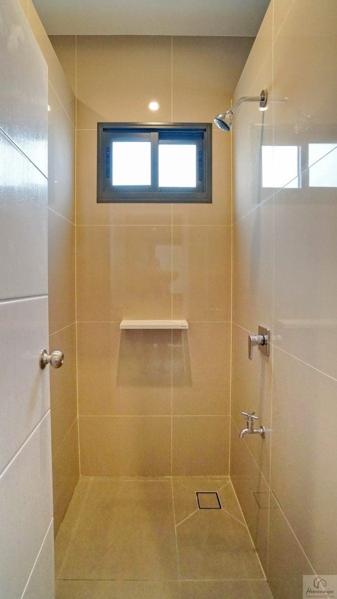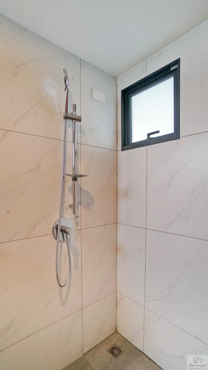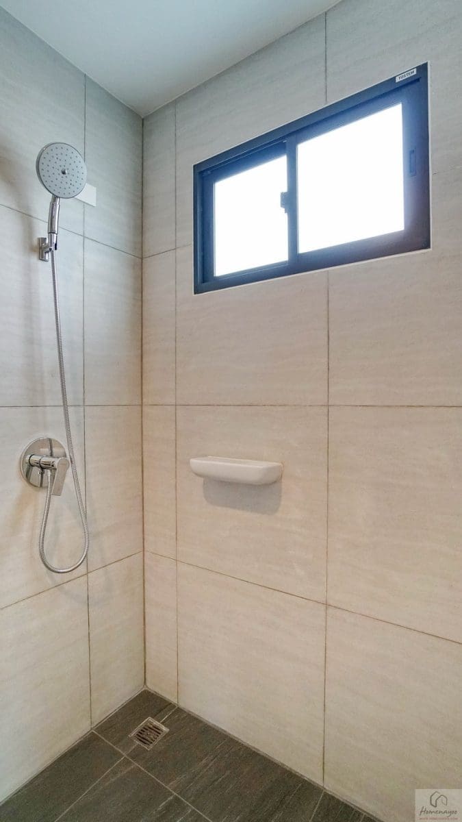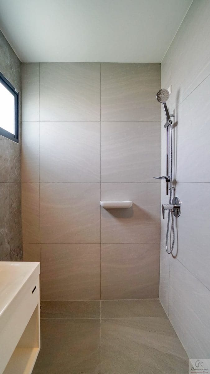 ส่วนบริเวณมุมอาบน้ำจุดนี้สามารถติดตั้งฉากหรือม่านกั้นเพิ่มเติมได้ ใช้ฝักบัว Hand Shower มีราวปรับระดับสูง-ต่ำและชั้นวางสบู่ในตัว ด้านข้างติดชั้นวางเซรามิกมาให้ 1 ชิ้น เดินงานระบบไฟฟ้ามี Junction Box รองรับการติดตั้งเครื่องทำน้ำอุ่นให้เรียบร้อย มีตัวช่วยในการระบายอากาศและความชื้นเป็นหน้าต่างบานเลื่อนกระจกฝ้า 1 บาน