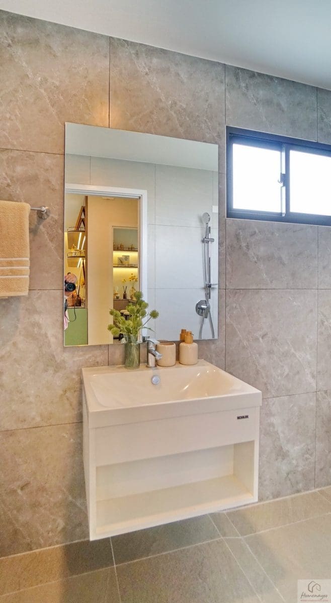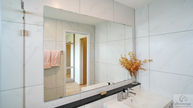 ติดกระจกเงาบานใหญ่เต็มพื้นที่ให้ 1 บาน ด้านหลังก่อ Low Wall วางของใช้หรือของตกแต่งอื่น ๆ ได้อีกเยอะ ฝั่งตรงข้ามมีราวแขวนผ้าขนหนู 1 ชิ้น