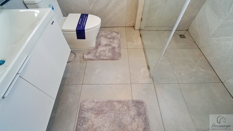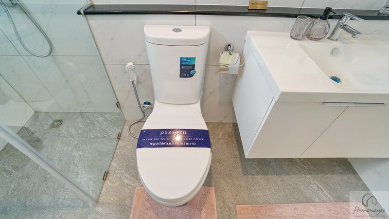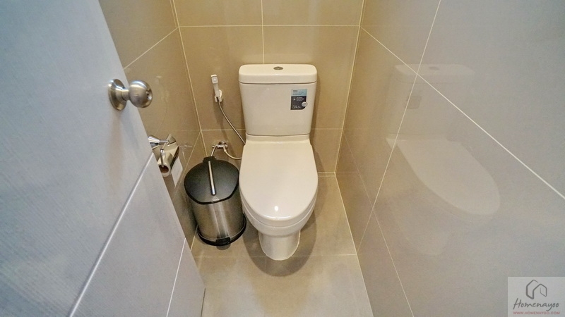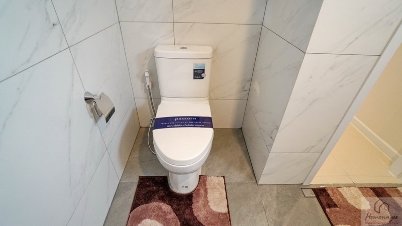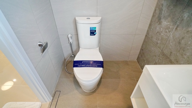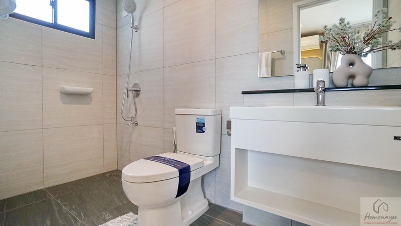 มุมโถสุขภัณฑ์ 2 Piece ระบบ Dual Flush ระยะการนั่งใช้งานสบาย ๆ, มุมอาบน้ำใช้ฝักบัว Hand Shower มีราวปรับระดับสูง-ต่ำและชั้นวางสบู่ในตัว ติดชั้นวางเซรามิกเพิ่มให้อีก 1 ชิ้น บนผนังเดินงานระบบไฟฟ้ามี Junction Box รองรับการติดตั้งเครื่องทำน้ำอุ่นให้เรียบร้อย