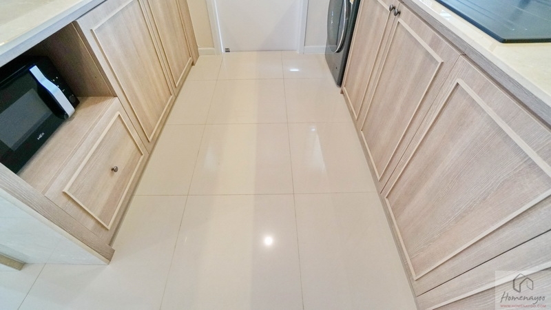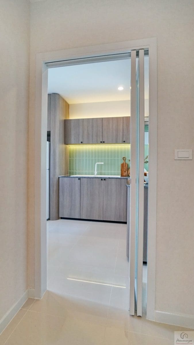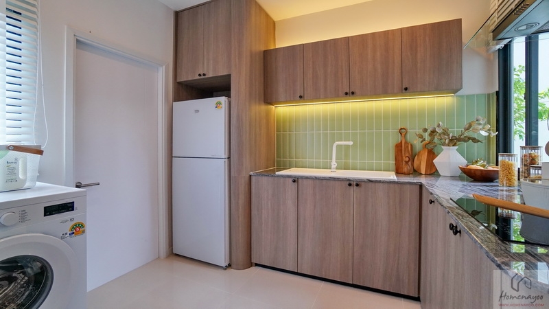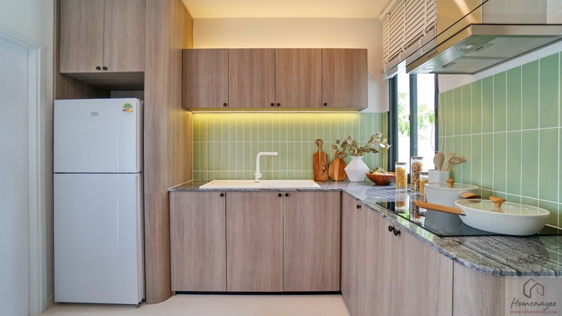 บ้านตัวอย่างกรุผนัง Backsplash เป็นกระเบื้องโทนสีเขียว Pastel สวย ๆ ฝั่งหน้าบ้านมีหน้าต่างช่วยระบายอากาศให้ 1 จุด มีตู้เก็บของหน้าบานปิดแบบ Soft Close ทั้งบน-ล่าง