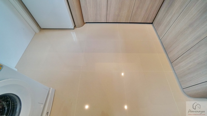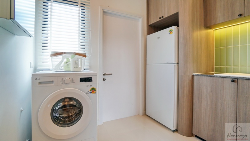 อีกฝั่งบ้านตัวอย่างจัดเป็นมุมเครื่องซักผ้าและตู้เย็นให้ดูเป็นไอเดีย มีช่องแสงเพิ่มให้อีก 1 บาน พร้อมประตูเปิดเชื่อมออกไปยังส่วนซักล้างหลังบ้านได้