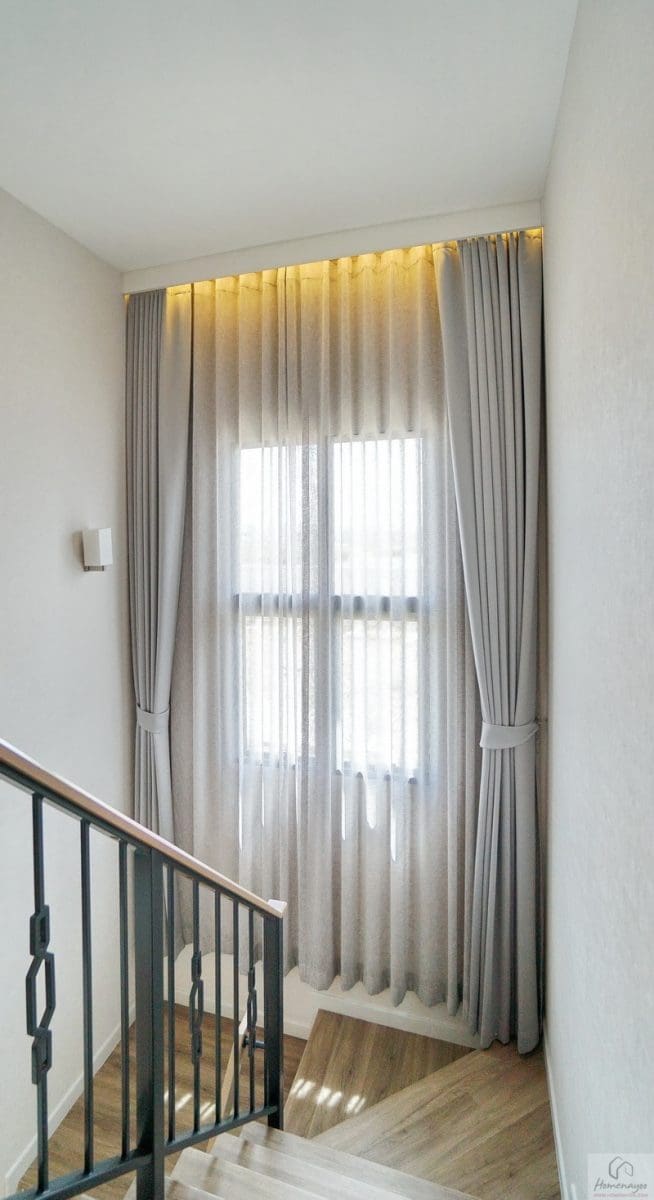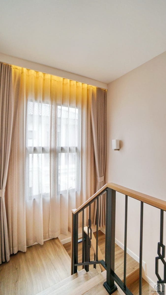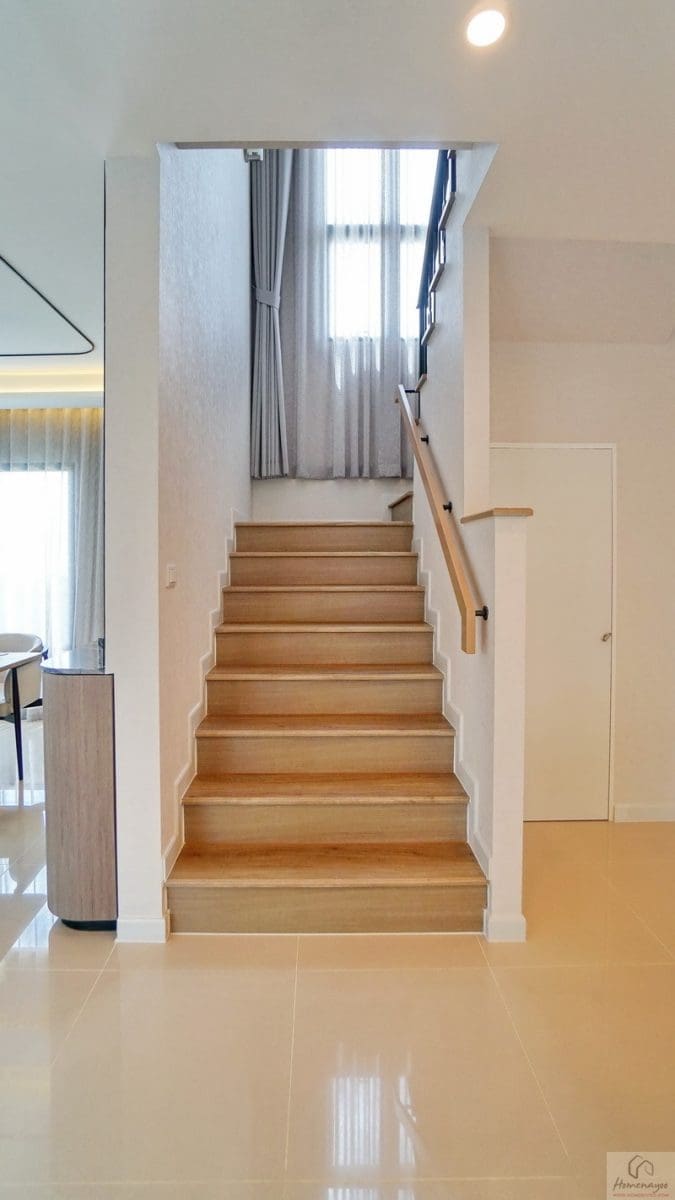 โถงบันไดบ้านสูงโปร่งรับแสงธรรมชาติจากภายนอกเข้ามาได้เยอะจากช่องแสงบานใหญ่แบบ Oversize ทำให้บรรยากาศดูสว่างโปร่ง โล่ง มากยิ่งขึ้น