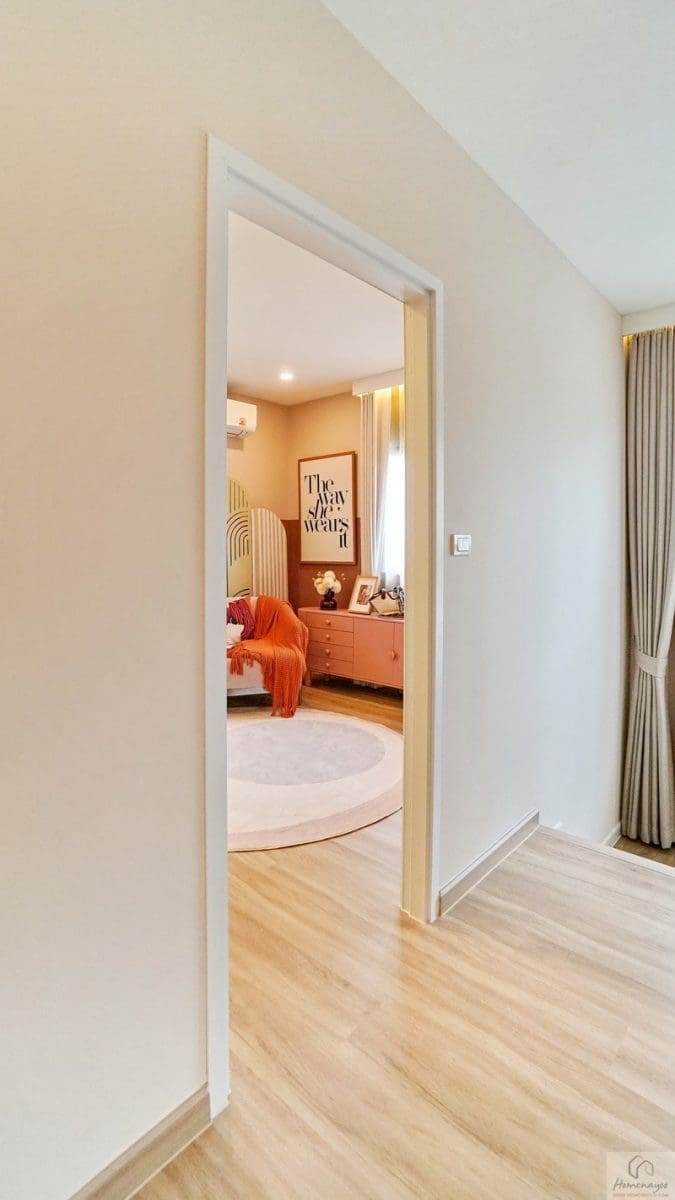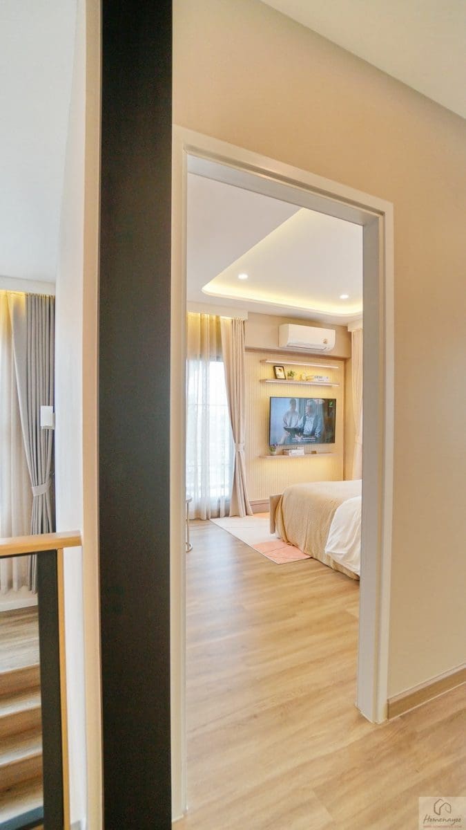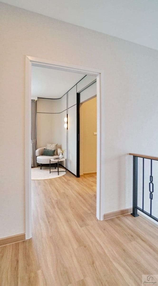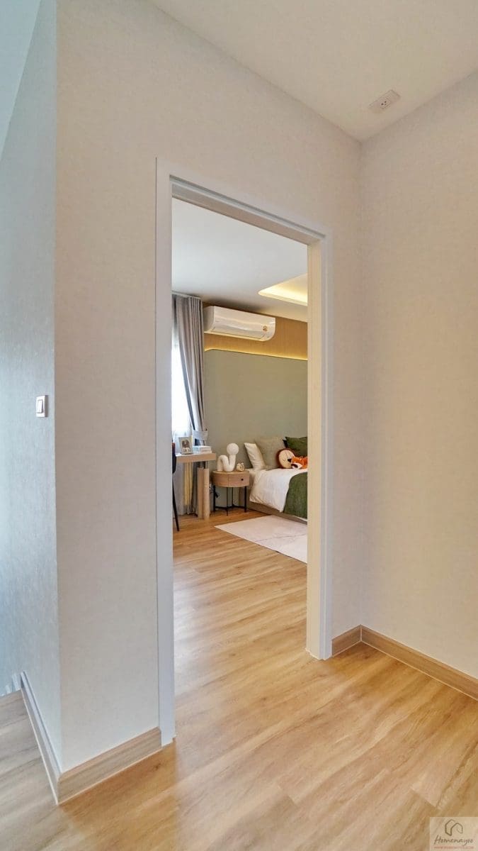 ขึ้นมาที่ชั้น 2 ของตัวบ้านจะเจอโถงทางเดินกว้างแจกไปยังส่วนต่าง ๆ พื้นปู SPC ลายไม้สวยงาม กันน้ำ กันปลวก ความสูงเพดานอยู่ที่ 2.6 ม. มีพัดลมช่วยระบายอากาศติดตั้งมาให้ ฝั่งขวาคือ Master Bedroom เป็นห้องแบบตอนลึกได้พื้นที่ฝั่งนี้ทั้งหมด ตรงกลางคือห้องนอน 2 และทางซ้ายติดกับทางขึ้น-ลงจะเป็นห้องนอน 3