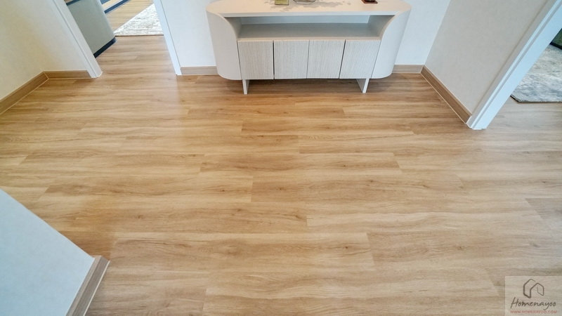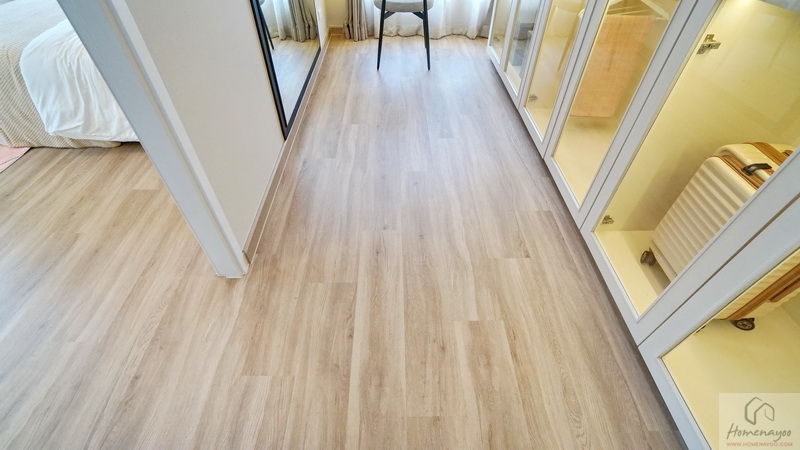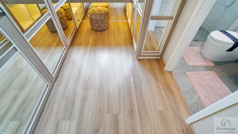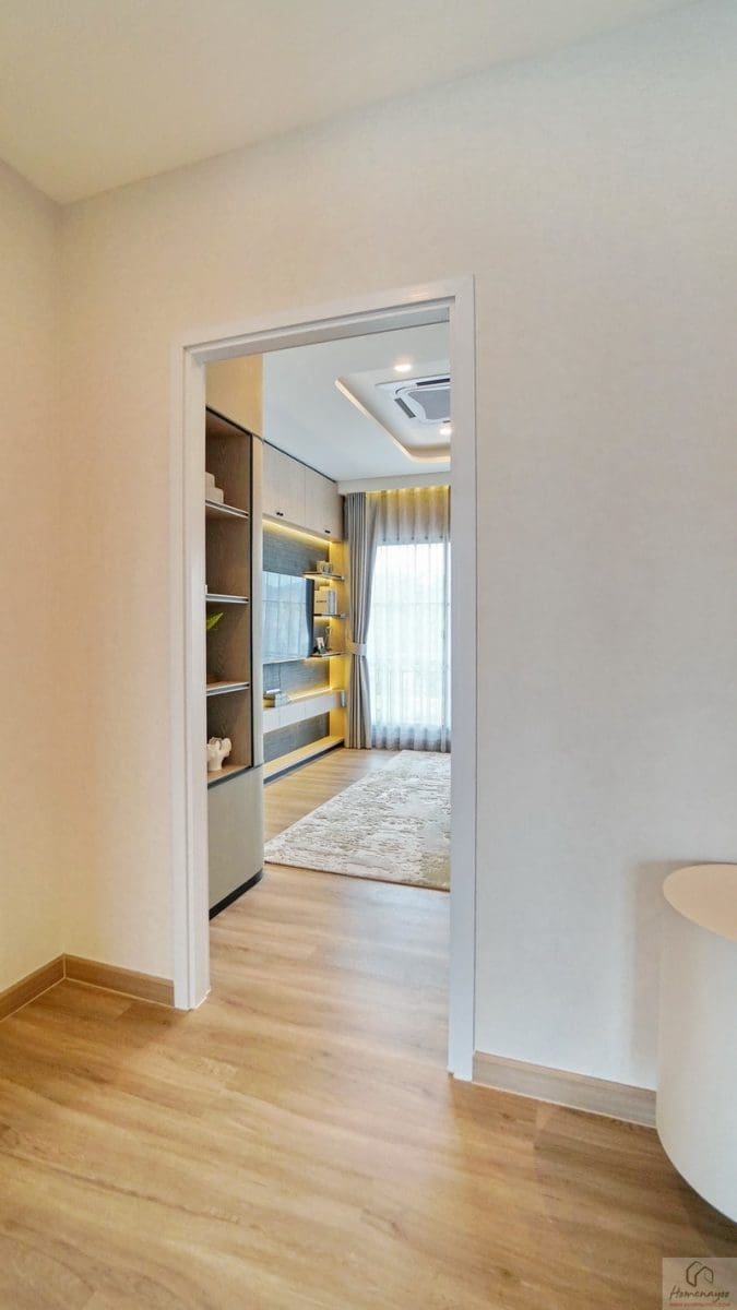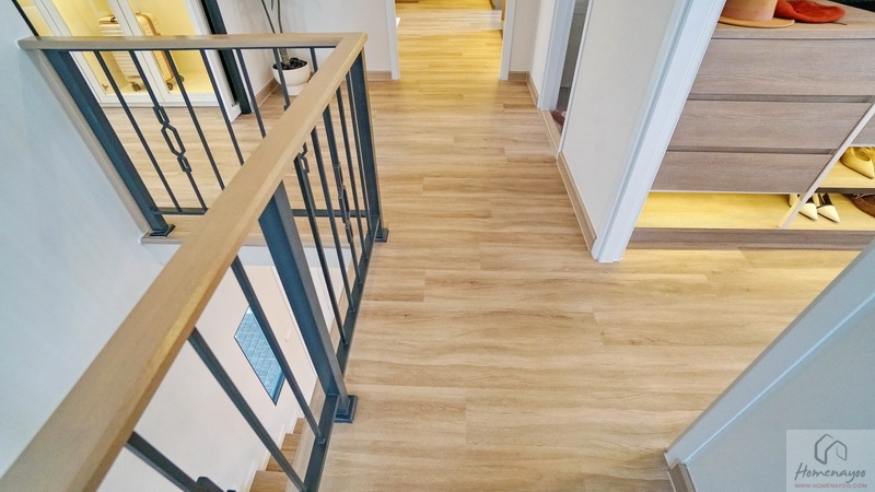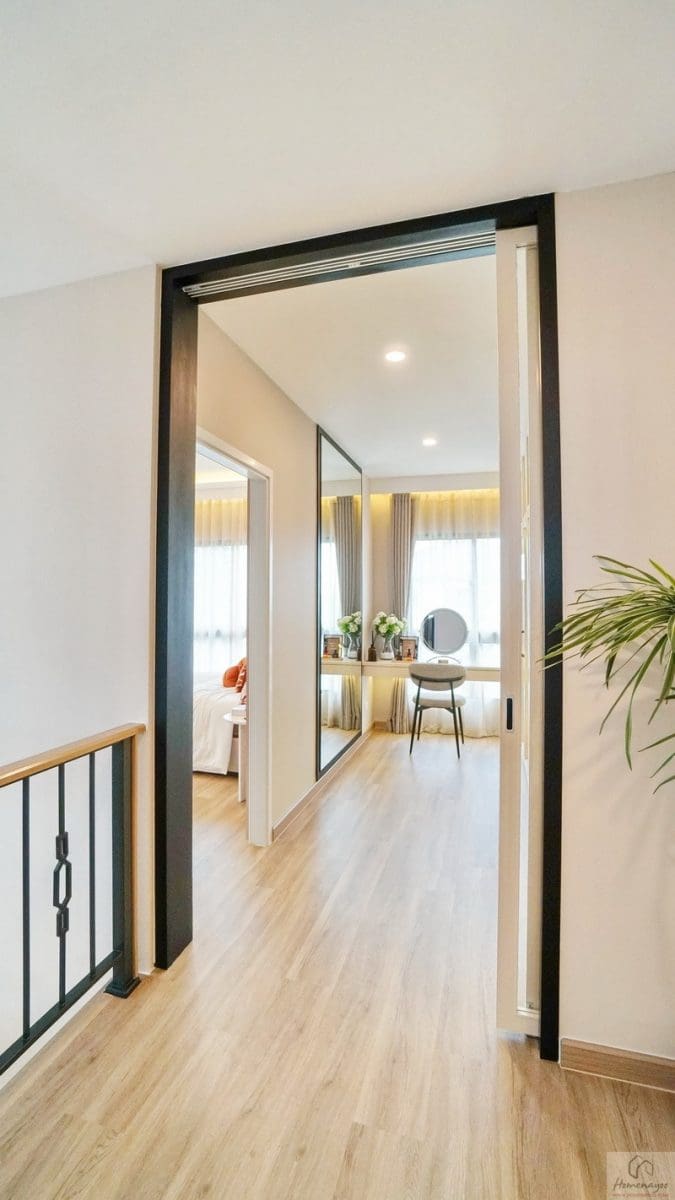 ขึ้นมาที่ชั้น 2 ของตัวบ้านจะเจอโถงทางเดินกว้างแจกไปยังส่วนต่าง ๆ พื้นปู SPC ลายไม้สวยงาม กันน้ำ กันปลวก ความสูงเพดานอยู่ที่ 2.6 ม. มีพัดลมช่วยระบายอากาศติดตั้งมาให้ ฝั่งขวาคือ Master Bedroom เป็นห้องแบบตอนลึกได้พื้นที่ฝั่งนี้ทั้งหมด ตรงกลางคือห้องนอน 2 และทางซ้ายติดกับทางขึ้น-ลงจะเป็นห้องนอน 3