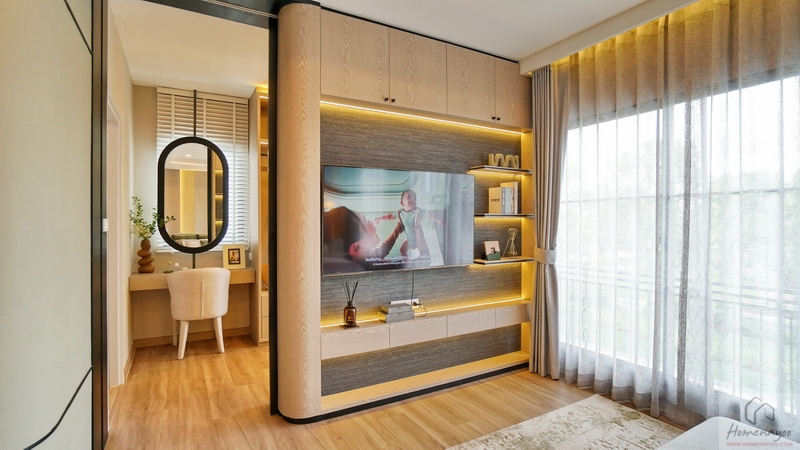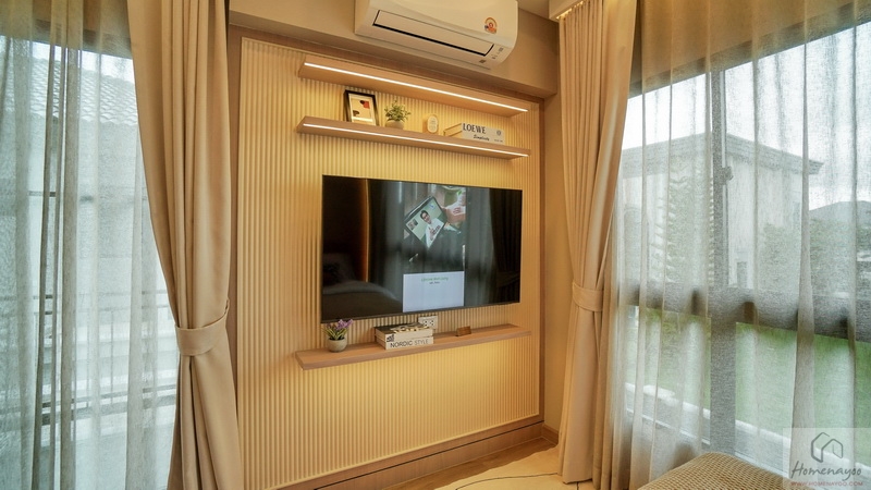 ฝั่งปลายเตียงผนังกว้างพอเหมาะจัดเป็นมุมชั้นวางทีวีสวย ๆ บนผนังเดินงานระบบไฟฟ้ามาให้พร้อมต่อใช้งาน พื้นปลายเตียงหลังจากวางสตูลแล้วยังเหลืออยู่เยอะ ทำให้เดินเข้า-ออกไปยังส่วนต่าง ๆ ของห้องได้สะดวก
