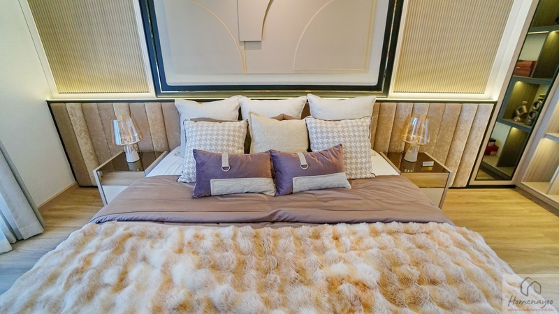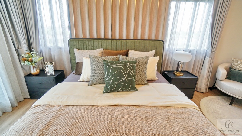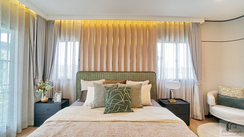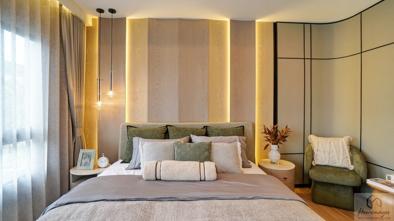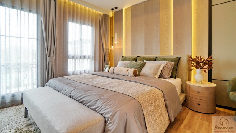 ฝั่งหัวเตียงกรุผนังสวย ๆ ดูหรูหรา วางโต๊ะด้านข้างไว้ 2 ฝั่งให้ดูระยะการใช้งาน มีหน้าต่างรับแสงมาให้ 2 จุด