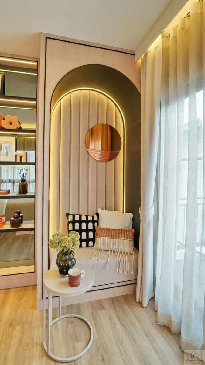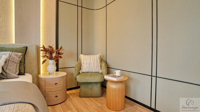 ข้างเตียงฝั่งขวาจัดเป็นมุมนั่งเล่นพักผ่อนหรือมุมโต๊ะทำงานเพิ่มเติมได้ พื้นที่ใช้งานเหลือกว้างใช้งานสะดวก