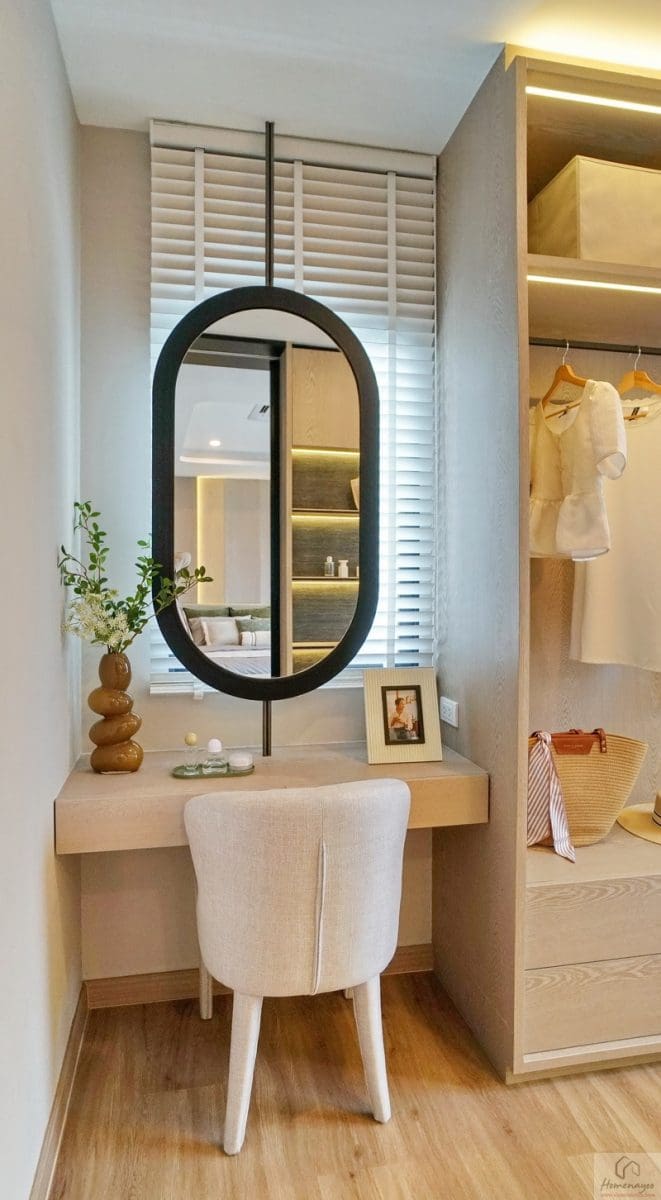 ตรงกลางจัดเป็นมุมโต๊ะเครื่องแป้งขนาดมาตรฐาน 1 ที่นั่ง ติดกับช่องแสงบานใหญ่