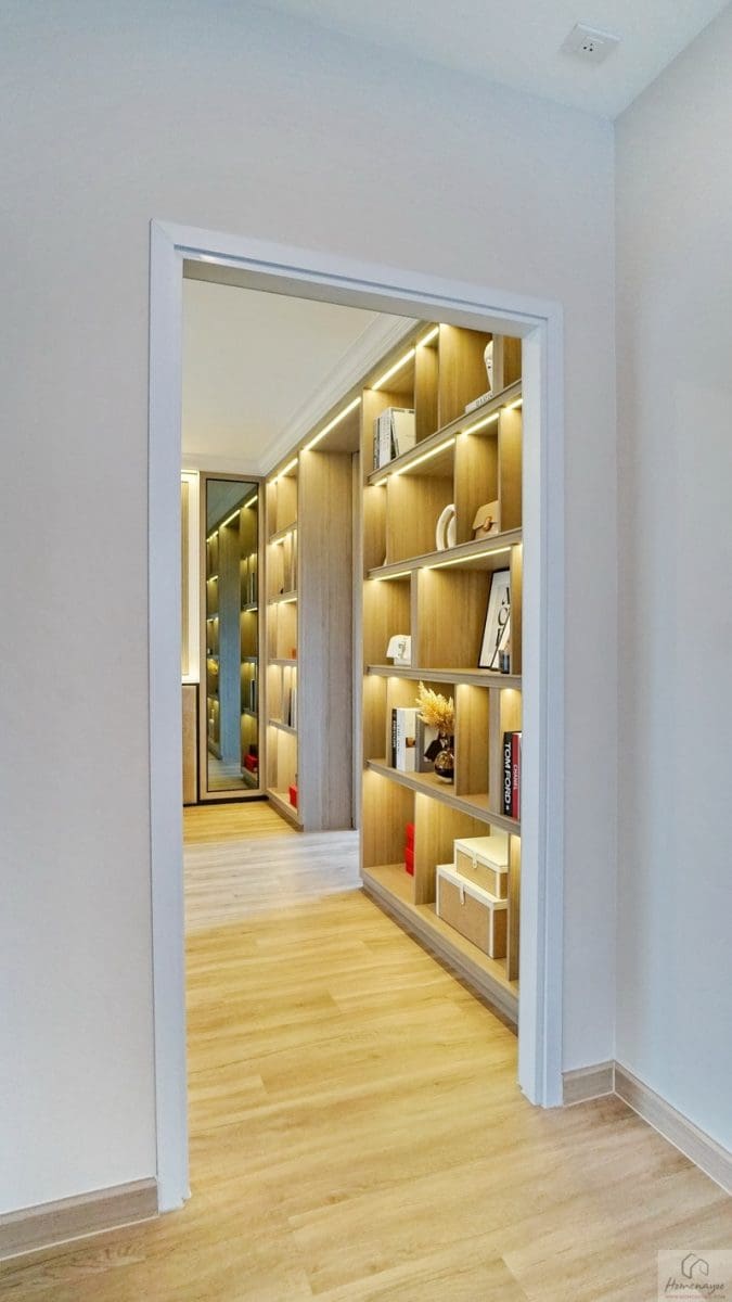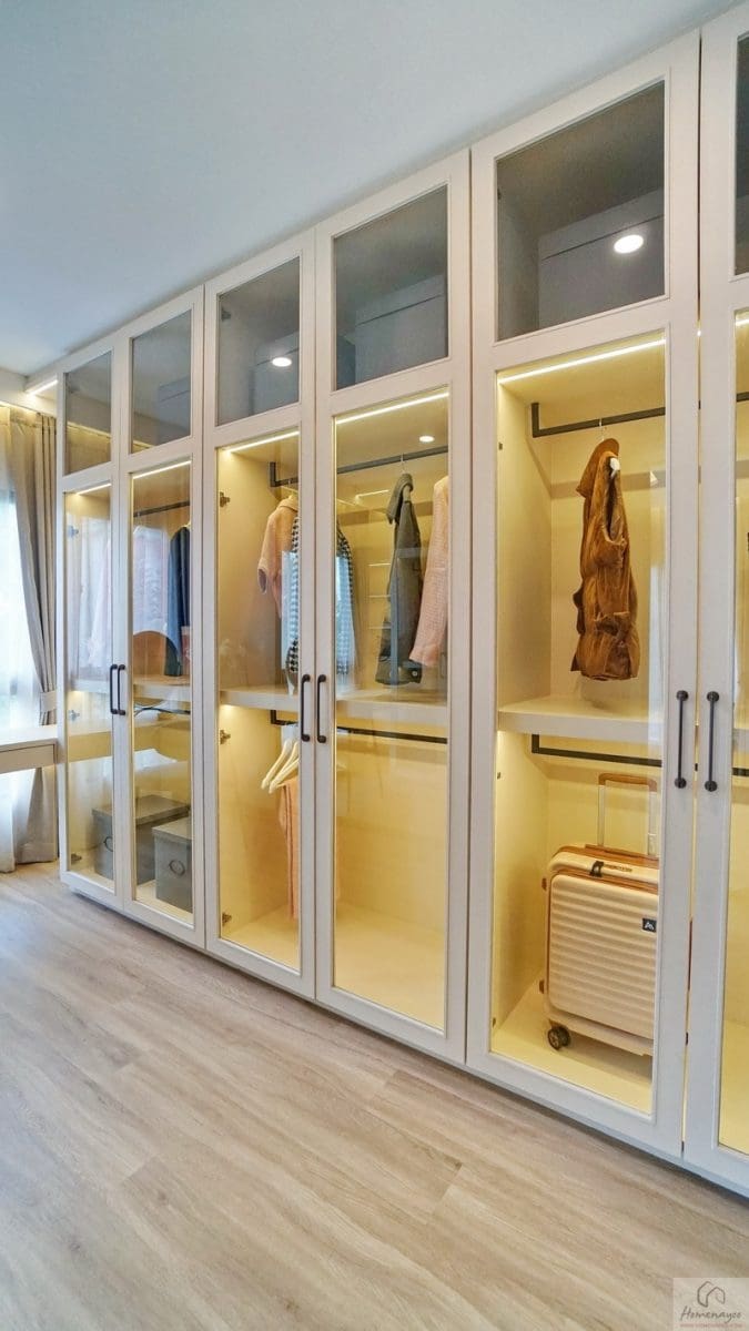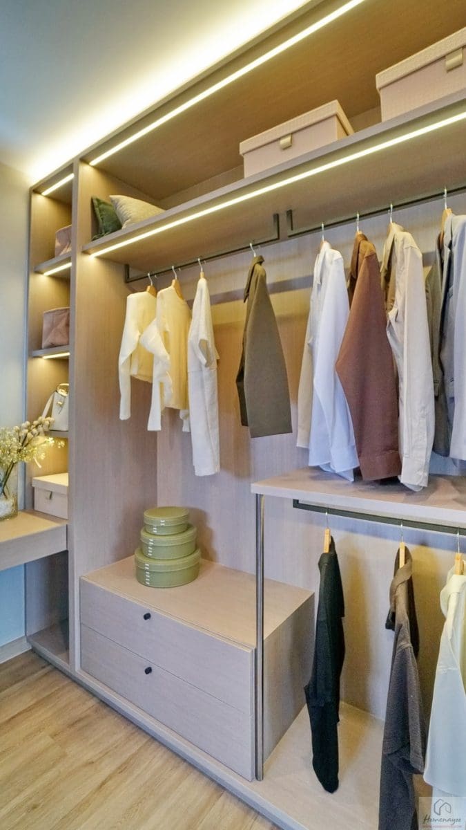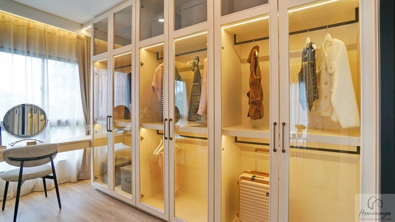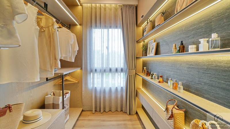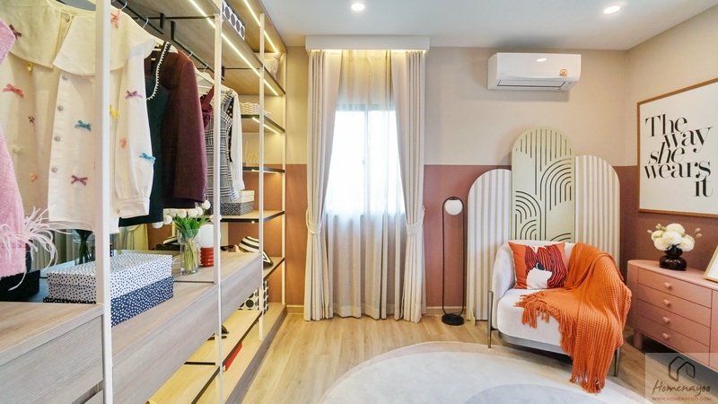 อีกฝั่งของห้องจัดเป็นโซน Walk-in Closet พื้นที่กว้างกำลังดีใช้งานสะดวก บ้านตัวอย่าง Built-in ฝั่งซ้ายเป็นราวแขวนเสื้อผ้า ฝั่งขวาเป็นชั้นวางของ ตรงกลางได้หน้าต่างบานเลื่อนผสมบานฟิกซ์ 1 จุด