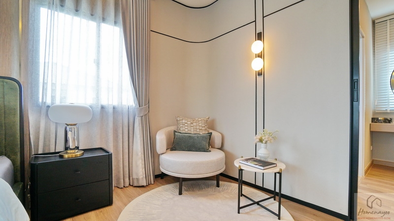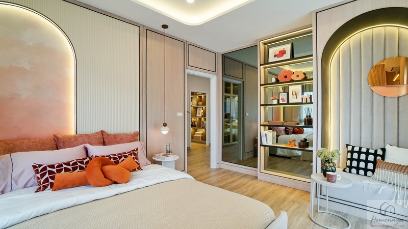 เข้ามาภายในห้องได้พื้นที่ใช้งานมากว้างขวาง เป็นห้องตอนลึกได้พื้นที่ตั้งแต่ด้านหน้าบ้านไปจนสุดหลังบ้านฝั่งนี้ทั้งหมด แบ่งการใช้งานไว้เป็น 2 ส่วน ฝั่งขวาเป็นโซนพักผ่อนสำหรับวางเตียงนอน มีระเบียงเปิดออกไปชมวิวฝั่งหน้าบ้าน ฝั่งซ้ายเป็นโซน Walk-in Closet และห้องน้ำในตัว