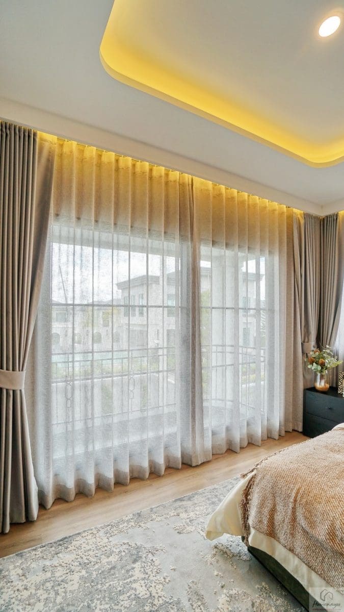 ส่วนฝั่งซ้ายข้างเตียงได้เป็นประตูกระจกบานเลื่อนขนาดใหญ่ ใช้เปิดรับลมชมวิวหรือระบายอากาศได้ดี มีราวเหล็กดัดกันตกมาให้เรียบร้อย และหน้าต่างบานเลื่อนขนาด Oversize ผสมบานฟิกซ์อีก 1 บาน