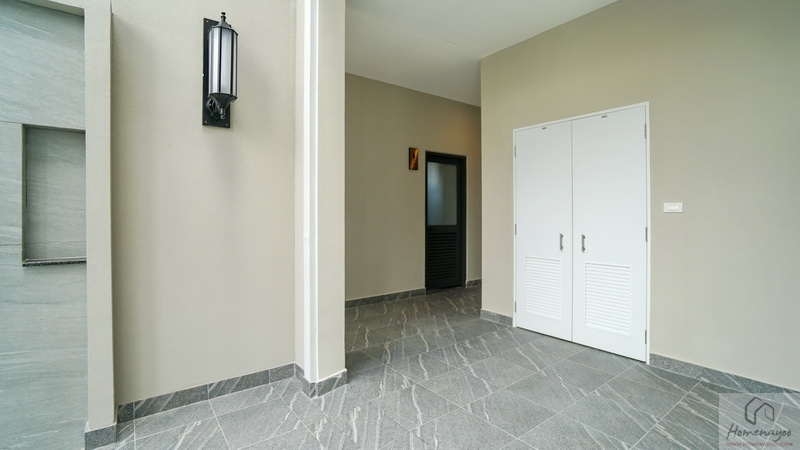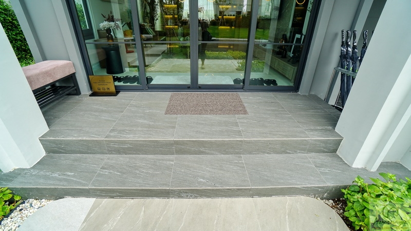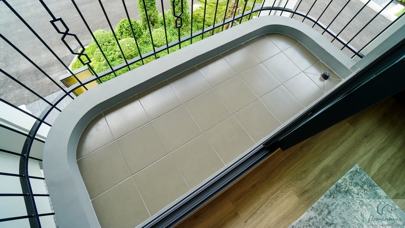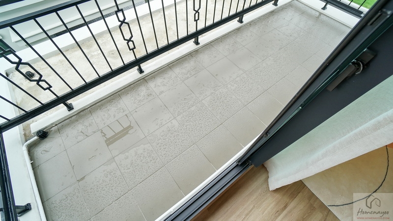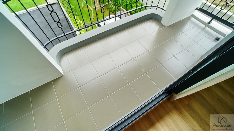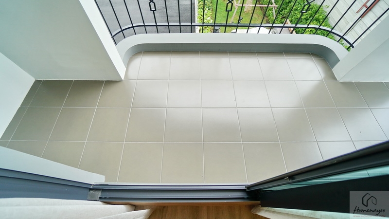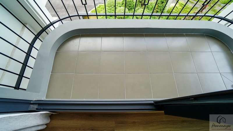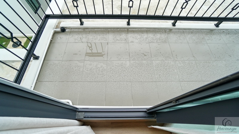 บริเวณระเบียงที่พื้นมีการยกสูงขึ้นมาเล็กน้อยเพื่อป้องกันฝุ่น, ความชื้น และสิ่งสกปรกต่าง ๆ พัดเข้าสู่ในห้อง ปูพื้นระเบียงด้วยกระเบื้องเซรามิกสีเข้ม พื้นที่ใช้งานกว้างกำลังดีสามารถจัดเป็นจัดเป็นมุมนั่งเล่นพักผ่อนแบบ Outdoor ได้เลย