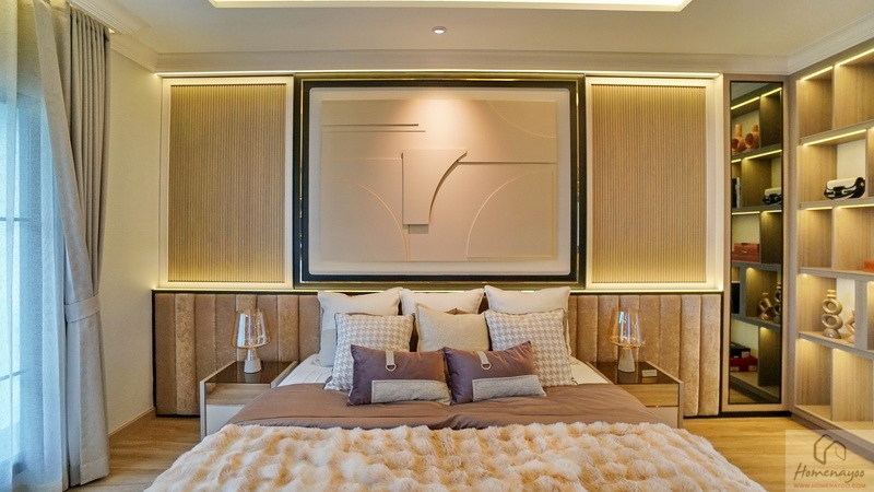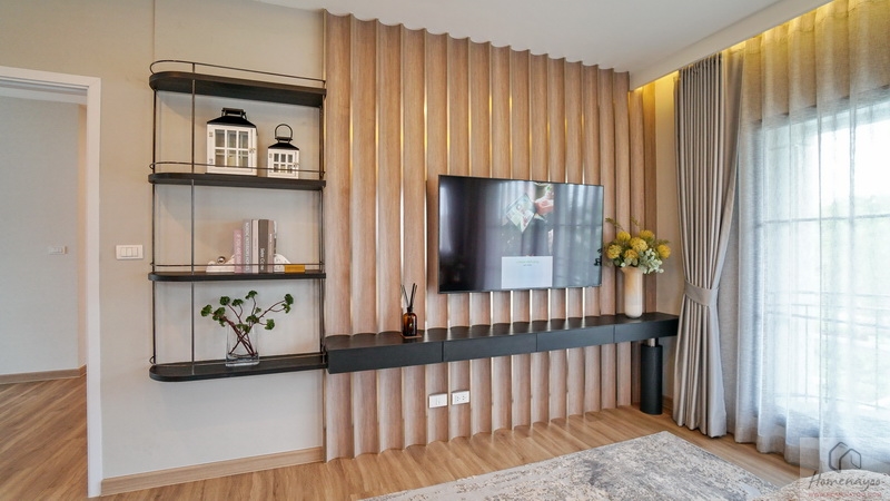 ฝั่งปลายเตียงผนังจุดนี้รองรับ Built-in ชั้นวางทีวีขนาดใหญ่ บนผนังเดินงานระบบไฟฟ้ามาให้เรียบร้อยพร้อมต่อใช้งาน บ้านตัวอย่างกรุผนังไม้สวย ๆ ติดชั้นวางของที่ด้านข้างให้ดูเป็นไอเดีย