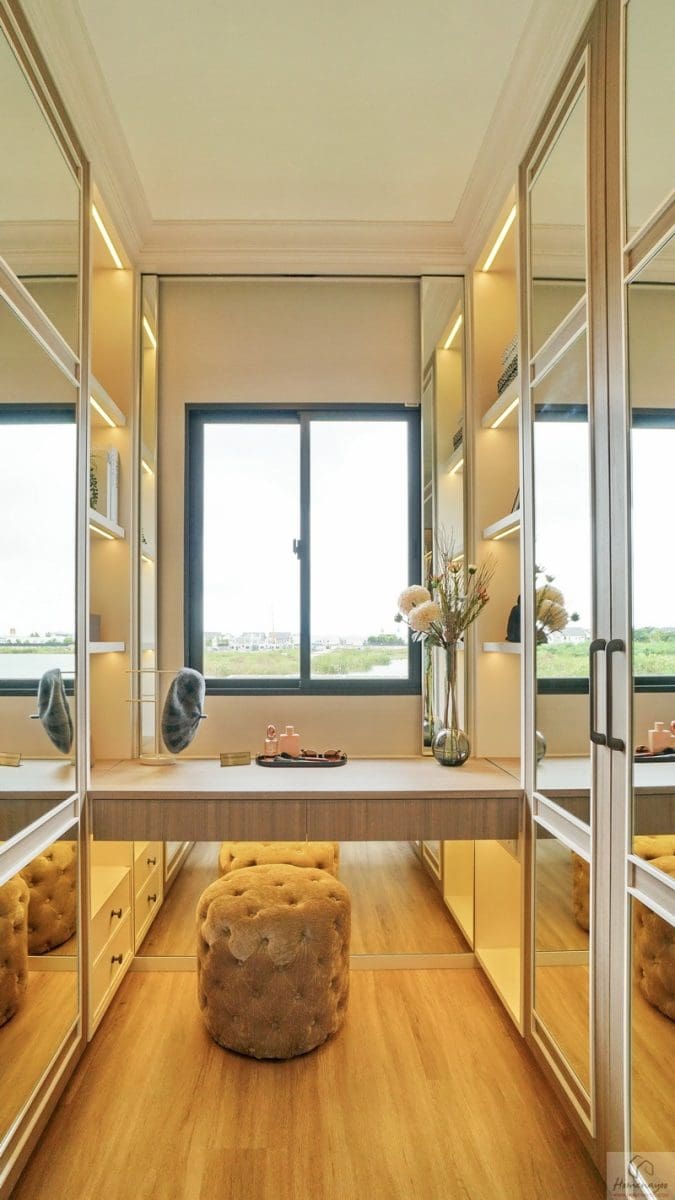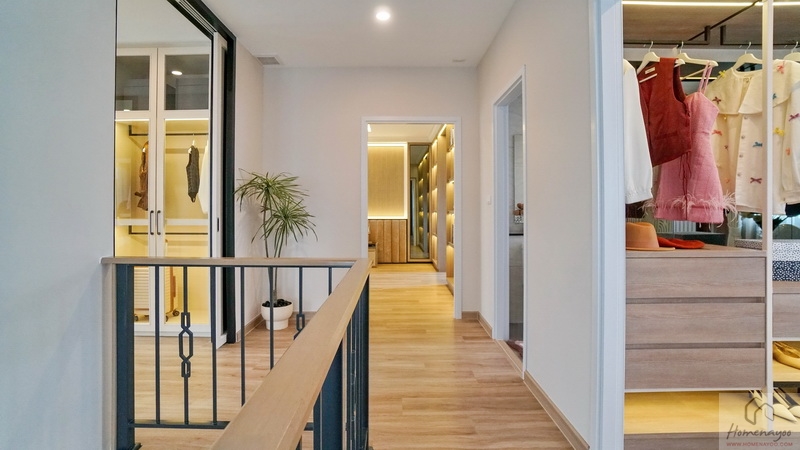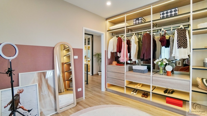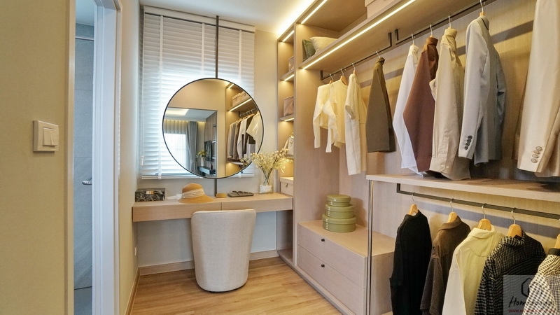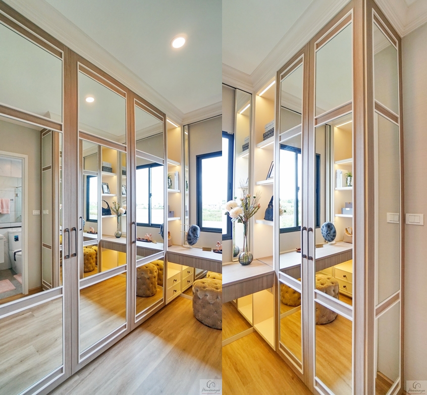 โซน Walk-in Closet จัดไว้เป็นสัดส่วนดี มีที่เหลือกว้างให้ยืนแต่งตัว, เลือกหยิบเสื้อผ้า หรือเดินเข้า-ออกห้องน้ำได้อย่างสะดวก