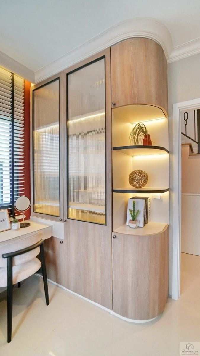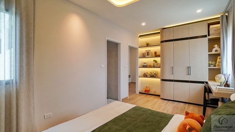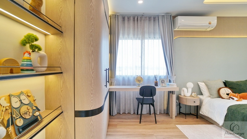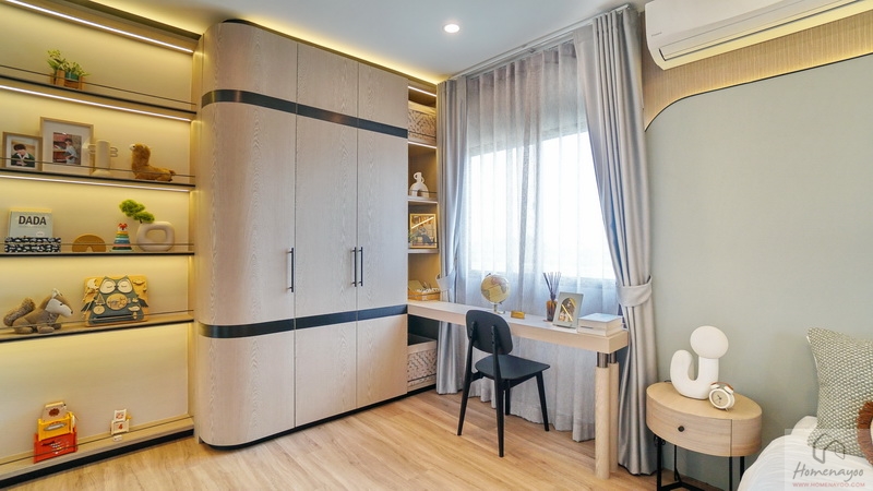 ข้างเตียงฝั่งซ้ายมีพื้นที่เหลือกว้างให้ Built-in เป็นตู้เสื้อผ้าใบใหญ่ พร้อมจัดเป็นมุมโต๊ะทำงานหรือโต๊ะเครื่องแป้ง บริเวณนี้มีหน้าต่างกระจกบานเลื่อนเป็นช่องรับแสงธรรมชาติให้ 1 บาน